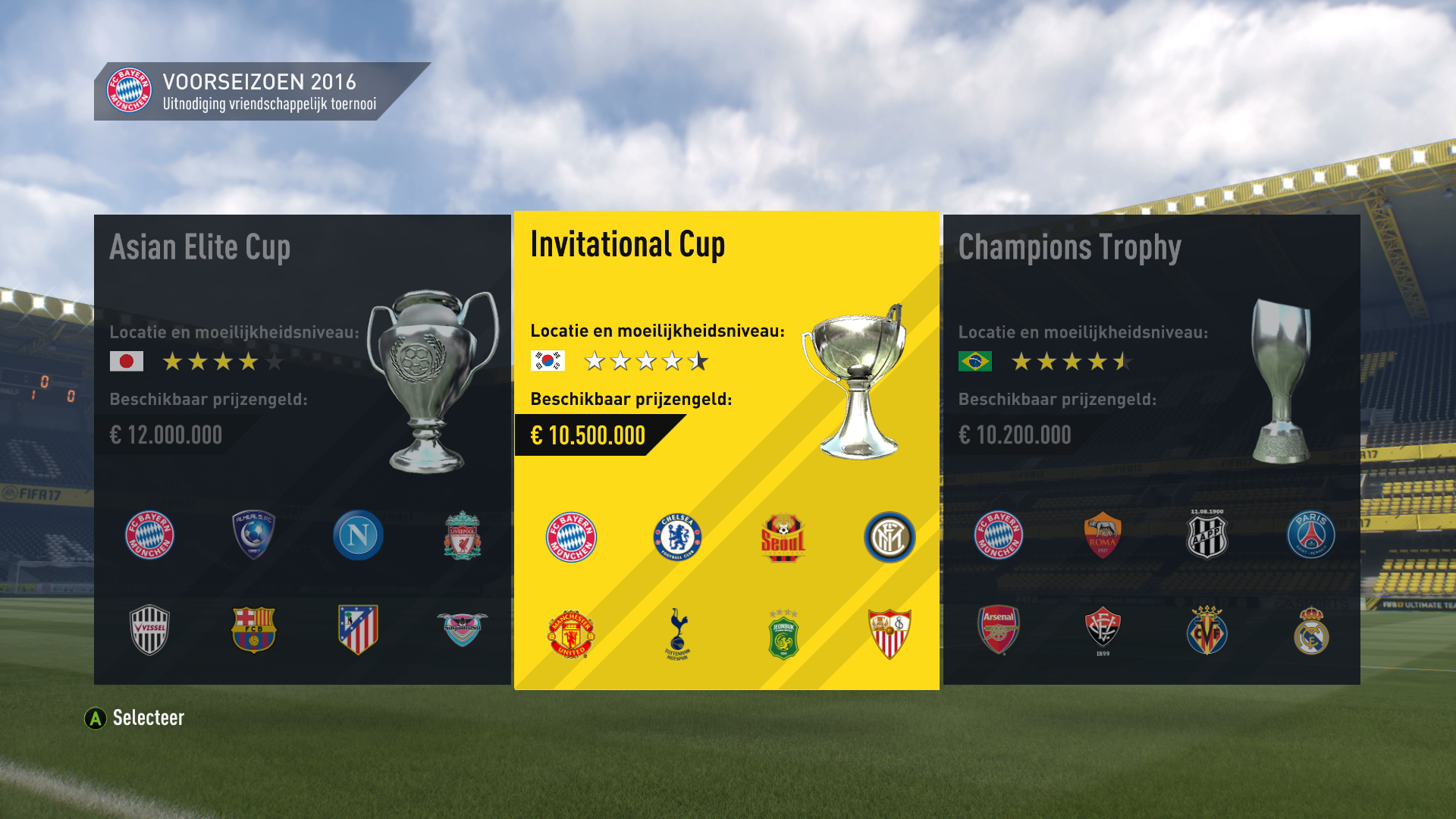 Je kunt uit verschillende toernooien over heel de wereld kiezen. Onderzoek eerst goed welke andere teams deelnemen om in te schatten hoe groot je kansen zijn om het toernooi te winnen. Elk toernooi heeft minstens een topper en de rest van het deelnemersveld wordt willekeurig samengesteld.