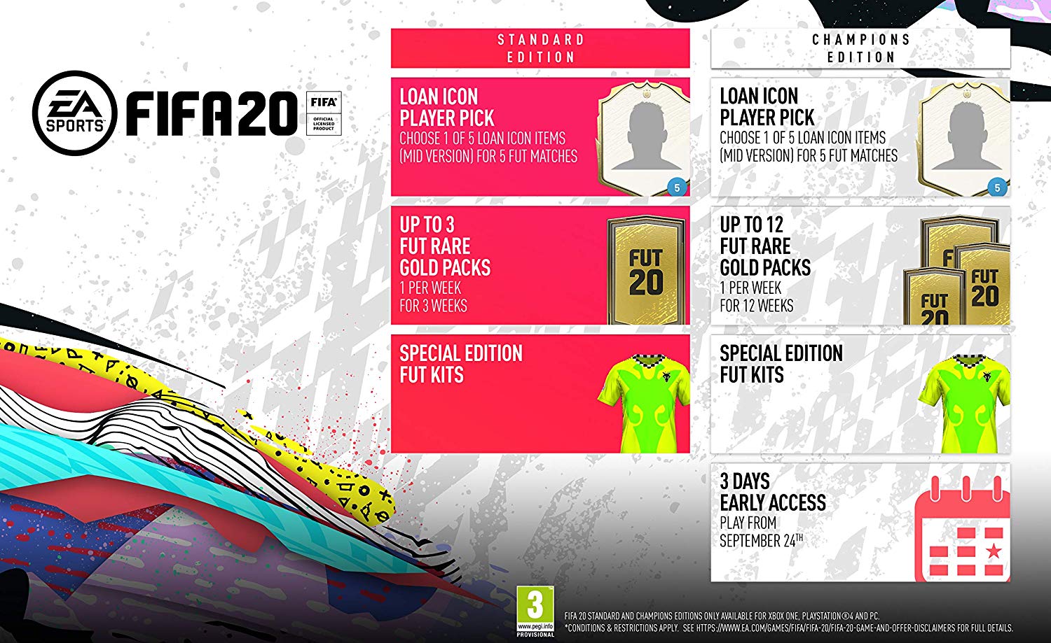 Wil je de FIFA 20 Standaardeditie kopen, krijg je daar voor vijf matches een leenicon naar keuze bij, uit de Mid-klasse. Daarnaast krijg je drie weken lang een Goud-pakket met FUT-kaarten, en een speciaal FUT-tenue voor je spelers.