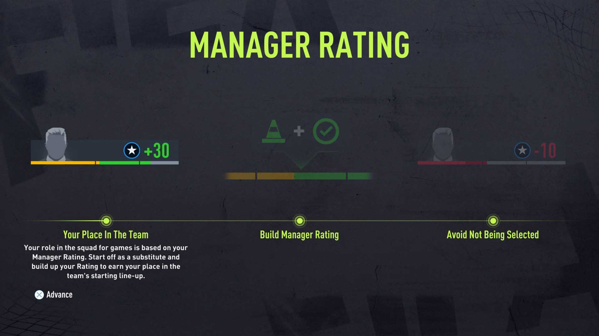 Manager-beoordeling is het systeem dat bijhoudt hoeveel de manager in jou gelooft. Als invaller heb je soms maar een paar minuten de tijd om je te bewijzen en de Wedstrijddoelstellingen te behalen. Ook je inzet tijdens trainingen speelt een rol. Wanneer de coach steeds meer vertrouwen in je heeft, krijg je meer speelminuten en kun je het uiteindelijk tot basisspeler schoppen. Houd er echter mee dat bij herhaaldelijk falen je buiten de wedstrijdselectie gelaten wordt of zelfs op de transferlijst kunt belanden. Ook is druk bij een topclub ('voor jou tien anderen') een stuk groter.