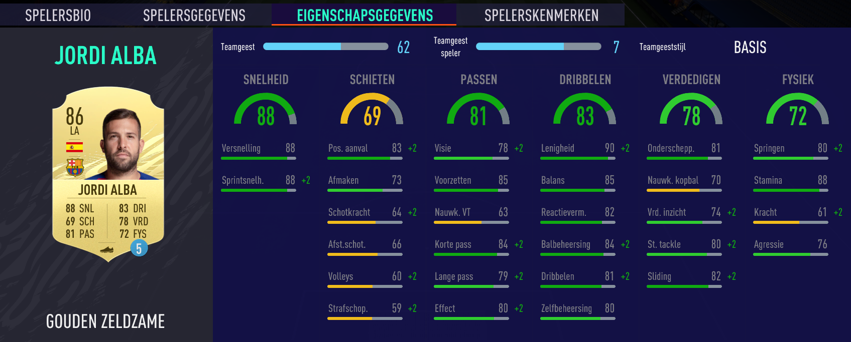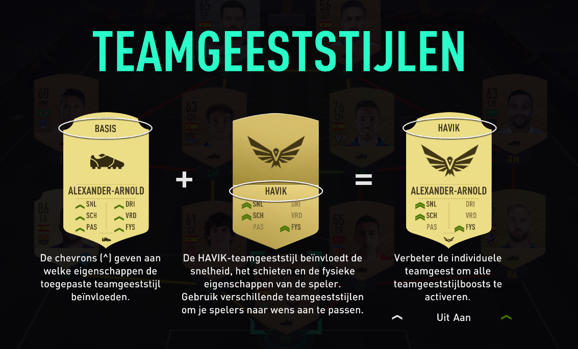 Teamgeeststijlen verhogen bepaalde eigenschappen van spelers, zoals Sprintsnelheid en Schotkracht. Die spelereigenschappen vallen onder de zes focusgebieden die je op de FUT-kaarten kunt vinden, zoals Snelheid (SNL) en Schieten (SCH).