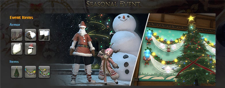 Daarnaast speel je kerstversieringen vrij voor je huis, of die van je Free Company (guild). Hier betreft het een kerstboom en twee verschillende muurdecoraties.