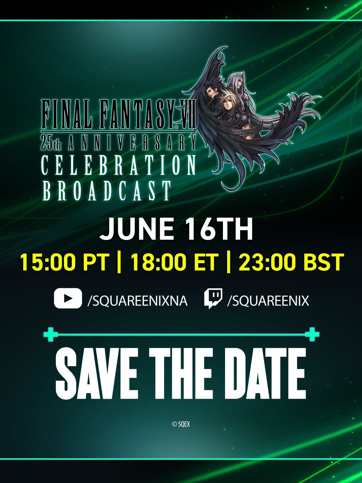 Square Enix laat weten dat de Final Fantasy 7 25th anniversary stream op 17 juni 2022 om 00:00 te bekijken is via YouTube en Twitch.