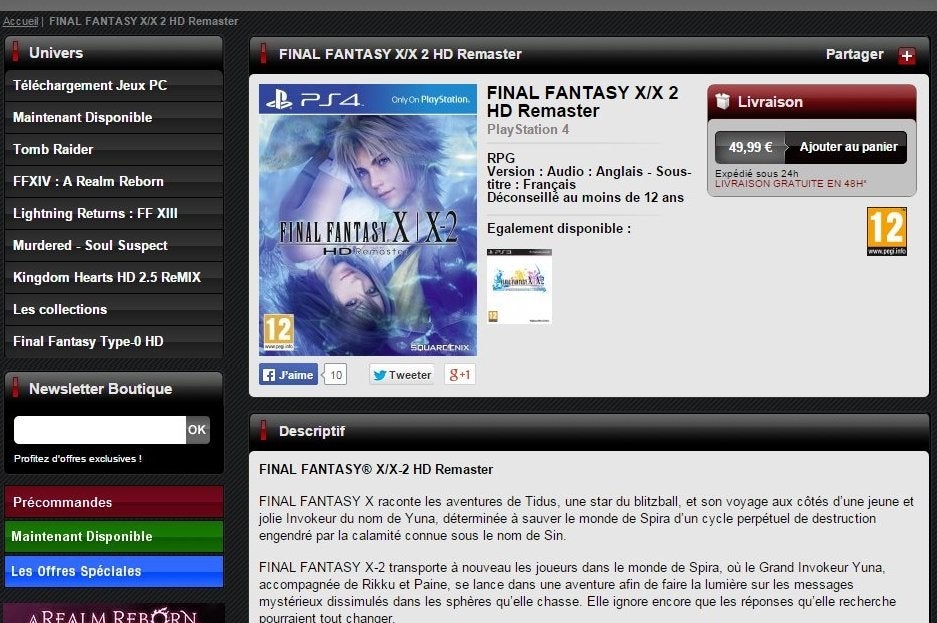 ORIGINEEL: Final Fantasy X/X-2 HD Remaster is tijdelijk voor de PlayStation 4 te koop geweest in de Franse versie van de webwinkel van Square Enix. Het product is inmiddels verwijderd, maar is nog te bekijken als Google Cache-versie.