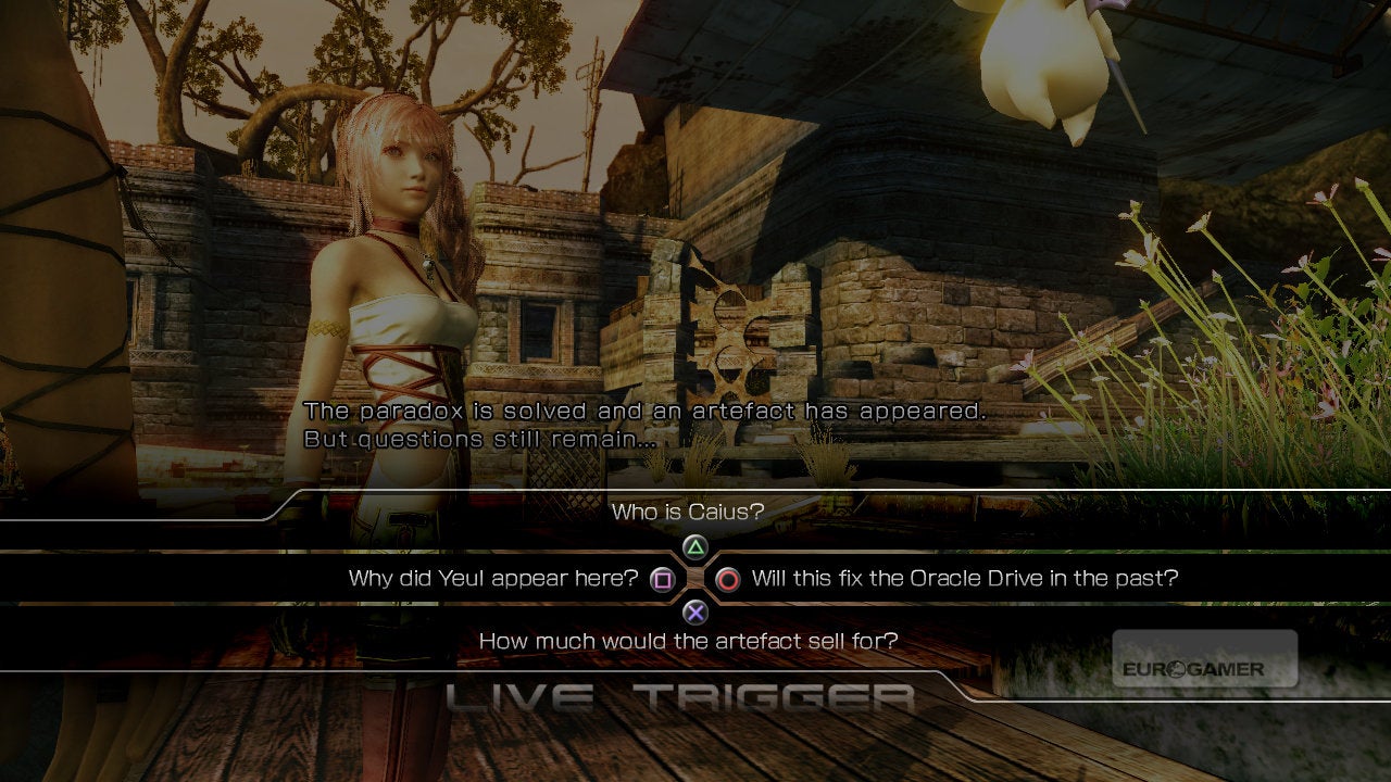 Mensen die nu heel verward naar hun scherm zitten te staren, op zoek naar enig narratief aangrijpingspunt moet ik jammer genoeg teleurstellen. Als je de vorige game niet helemaal snapte, ben je niet uitgenodigd op het Final Fantasy XIII-2 feestje. De game, hoewel het toch wel enkele unieke verhaalelementen kent, bouwt echter wel voort op de gebeurtenissen uit de vorige game. Ook wordt het verhaal op bepaalde ogenblikken behoorlijk moeilijk om te volgen doordat er constant tussen verschillende tijdszones gereisd wordt. Absolute aandacht houden is dus een absolute must.