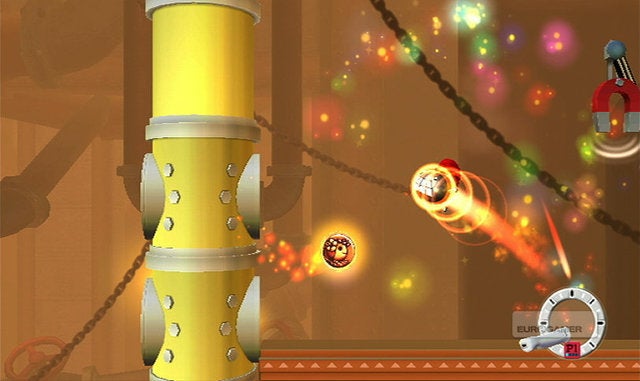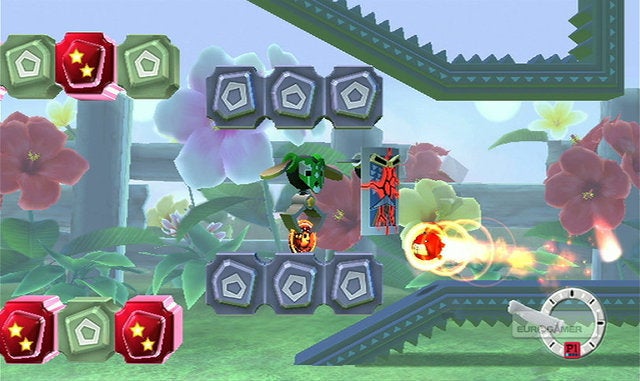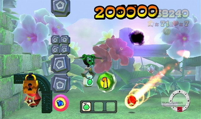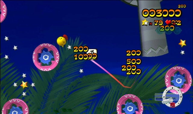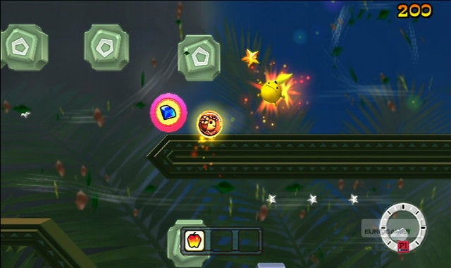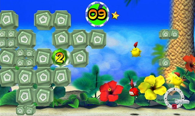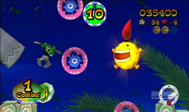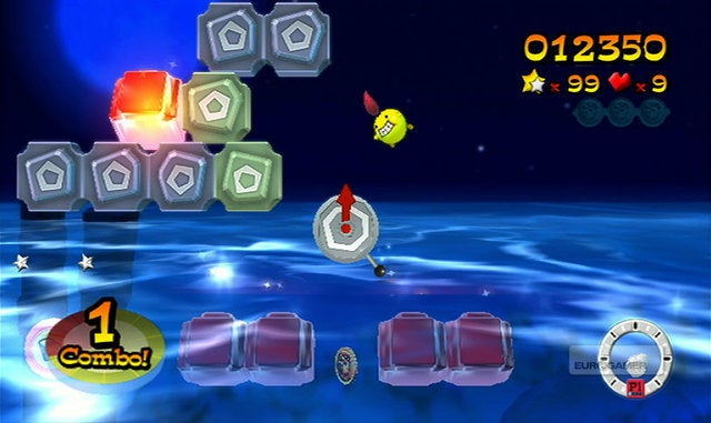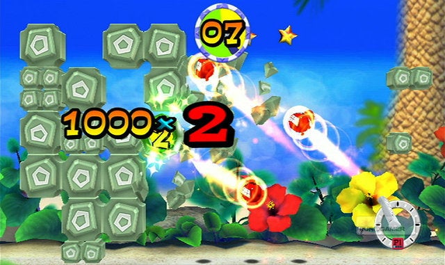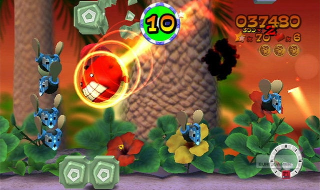 Waarom dat uitstel? Omdat er eigenlijk niet zo gek veel te vertellen valt over FlingSmash! In principe is dit spel een herwerkte versie van Breakout, het bekende arcadespel waarbij je met een balletje en een plankje dat je horizontaal mag bewegen alle blokjes die bovenaan het scherm hangen moet stukbotsen. Alleen is het balletje nu geel en is het uitgerust met een mond, ogen, armen, voeten en een rode paardenstaart. Het plankje waarop je banaankleurige balmonstertje zou moeten stuiteren is de Wii Remote Plus geworden, en de blokjes die in Breakout nog bovenaan het scherm te zien waren zweven nu overal rondom je. Ohw, en je mag je balletje in alle richtingen botsen in FlingSmash, niet enkel van boven naar onder. Een moeilijke uitleg voor een concept dat eigenlijk erg simpel is, en daardoor helaas ook snel herhalend gaat aanvoelen.