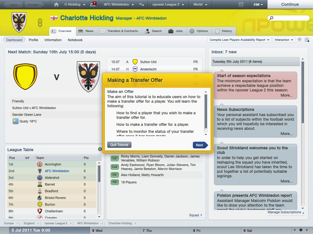 Nu leer je dus iets sneller waar het allemaal om draait in Football Manager 2012. Je leert een club besturen, lonen in het oog houden, coaches en training beheren, scoutingopdrachten aanmaken. Je leert hoe je zelf je eigen tactiek kan maken, wat veel van de eigenschappen betekenen, maar de link met je spelers en hun stats wordt nog wel niet perfect gelegd hier. Als laatste leer je ook tijdens de match je tactiek bijsturen, ook hier was iets meer concrete info welkom over de fijne details. Voor nieuwkomers is deze informatie echter een grote stap voorwaarts.