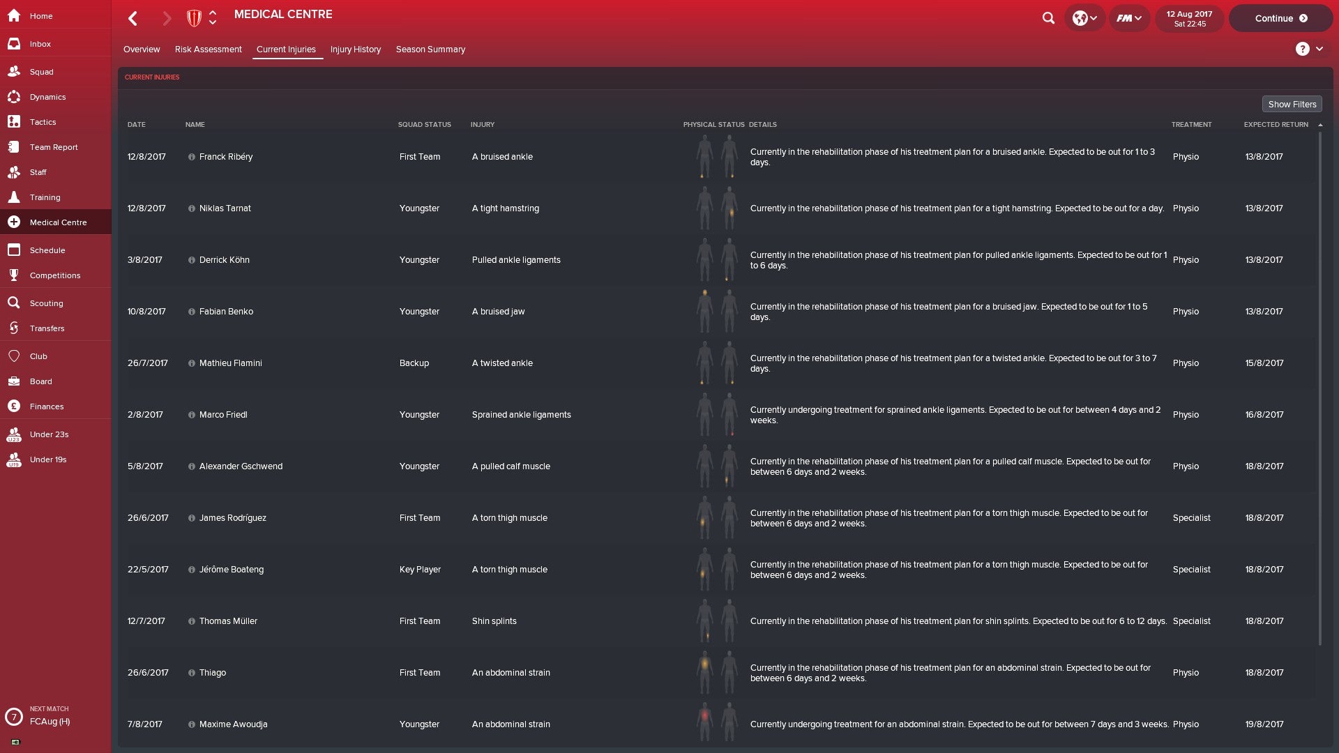 Dat geldt in grote mate ook voor het Medical Centre. In een overzicht van risicoschattingen zie je wie een verhoogde kans heeft op een blessure, en waarom. De lijst met huidige blessures geeft je een duidelijk overzicht van wie er in de lappenmand ligt, waardoor je beter je toekomstige opstellingen kunt plannen of alsnog een transfer kunt afronden. Ondanks alle informatie heb je geen directe optie om bijvoorbeeld het advies van je sportwetenschapper toe te passen. Een bepaalde speler traint misschien te hard en je kunt zijn regime weliswaar zelf aanpassen, maar je weet nooit helemaal zeker of dat het gewenste effect heeft. Bovendien raken spelers ook gewoonweg willekeurig geblesseerd, wat in de wedstrijden met regelmaat gebeurt. Hoewel je nu meer opties in handen hebt, blijft blessures voorkomen een beetje hit-and-miss.