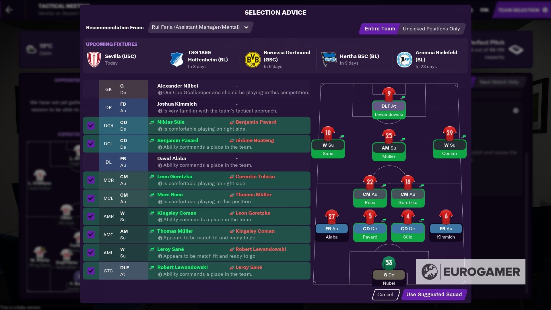 Interactie en info bundelen: het gaat maar door in FM2021. Voor de wedstrijd krijg je een suggestie voor het te kiezen team gebaseerd op bekwaamheid, fitness, of pure klasse. De staf brengt het team van veranderingen op de hoogte waarbij positieve en negatieve punten worden aangekaart. Dat is handig, want het analyserapport voor de volgende match was altijd al een inboxbericht. Je moest vroeger dus meteen handelen of alles onthouden. Sports Interactive centraliseert nu alle data voor jou, maar laat je alles ook afwegen. Advies van staf is niet langer een droge aangelegenheid, maar een haast tastbare discussie.