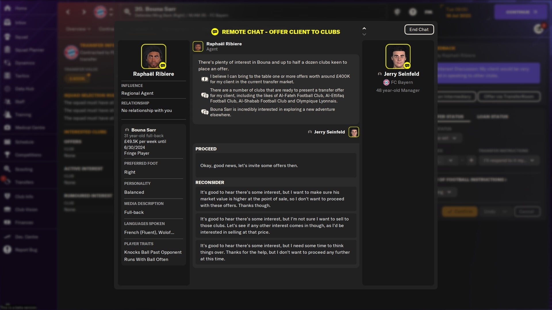 Een fijne extra zijn de nieuwe transferopties. Wanneer je nu de zaakwaarnemer van een speler over de marktinteresse bevraagt, genereert dat meteen interesse vanuit clubs die snel in actieve aanbiedingen overgaan. Of je huurt een tussenpersoon: verschillende agenten verzorgen aanbiedingen tegen een commissieprijs. Je hebt kortom veel minder problemen dan vroeger om spelers kwijt te raken, zelfs als er geen enkele club vooraf interesse had getoond. Bovendien zijn die opties een perfecte aanvulling op de Squad Planner van FM 2023 en geven de nieuwe Targets (een streefdoel zoals een aantal goals of assists) een incentive aan spelers om bij de club te blijven en hun best te doen. Inkomende en uitgaande transferopties zijn in Football Manager 2024 nog beter in balans.