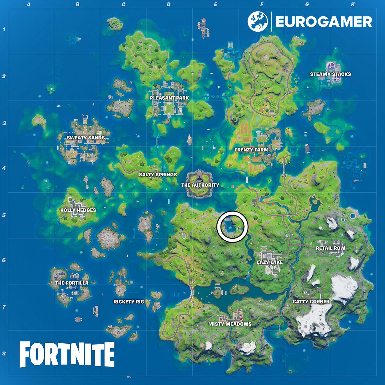 Om dat te doen moet je er eerst voor zorgen dat je de Aquaman skin gebruikt, alvorens je een match betreedt. Daarna moet je naar de Gorgeous Gorge gaan. Die ligt ten noordwesten van Lazy Lake.