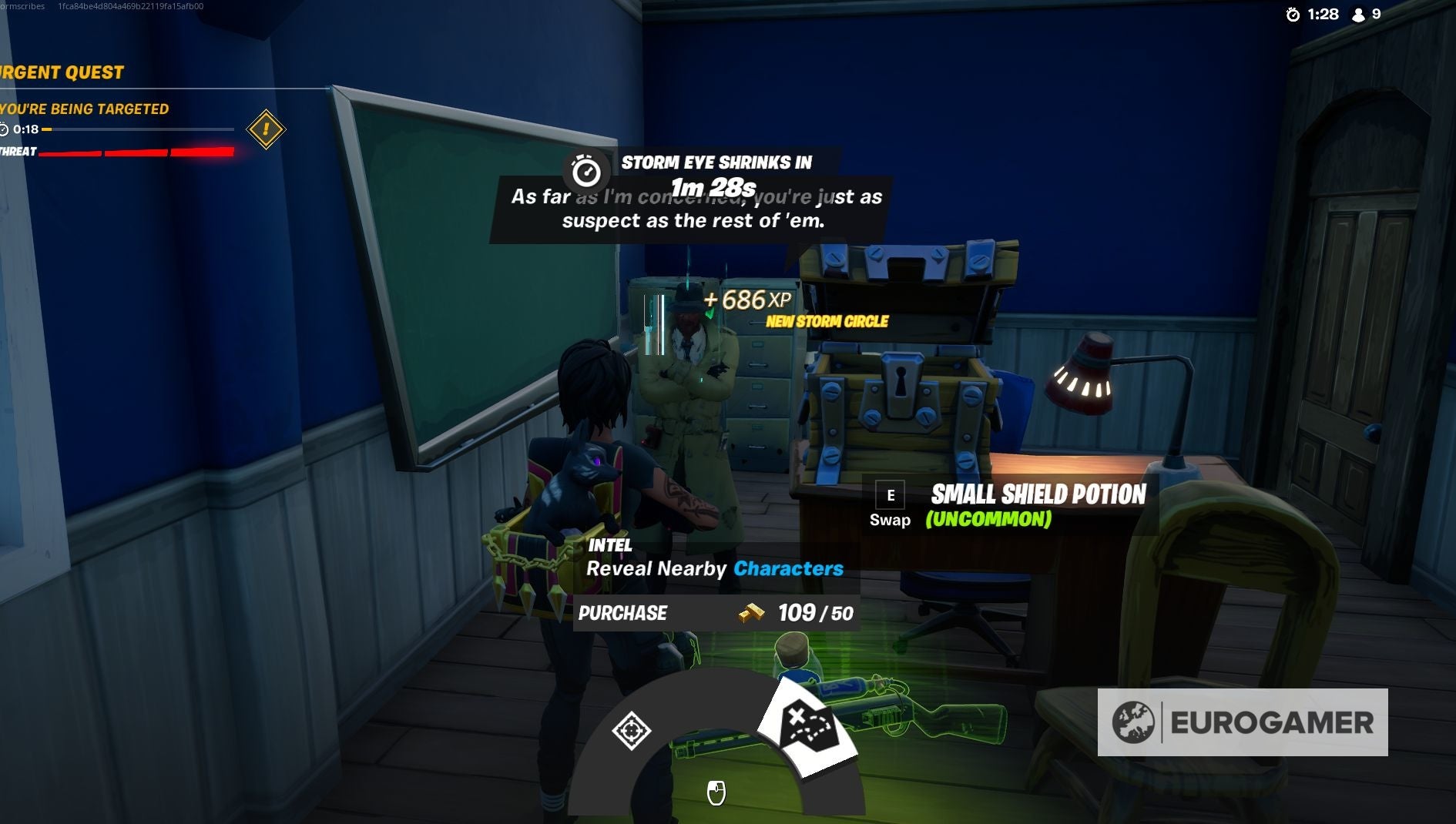Om je te helpen je doelwit te vinden, verschijnt er een gele cirkel op zowel je mini-map als de Fortnite map. Je doelwit bevindt zich ergens binnen die cirkel en het zal bewegen wanneer ze bewegen, zodat je in ieder geval weet of ze in beweging zijn.