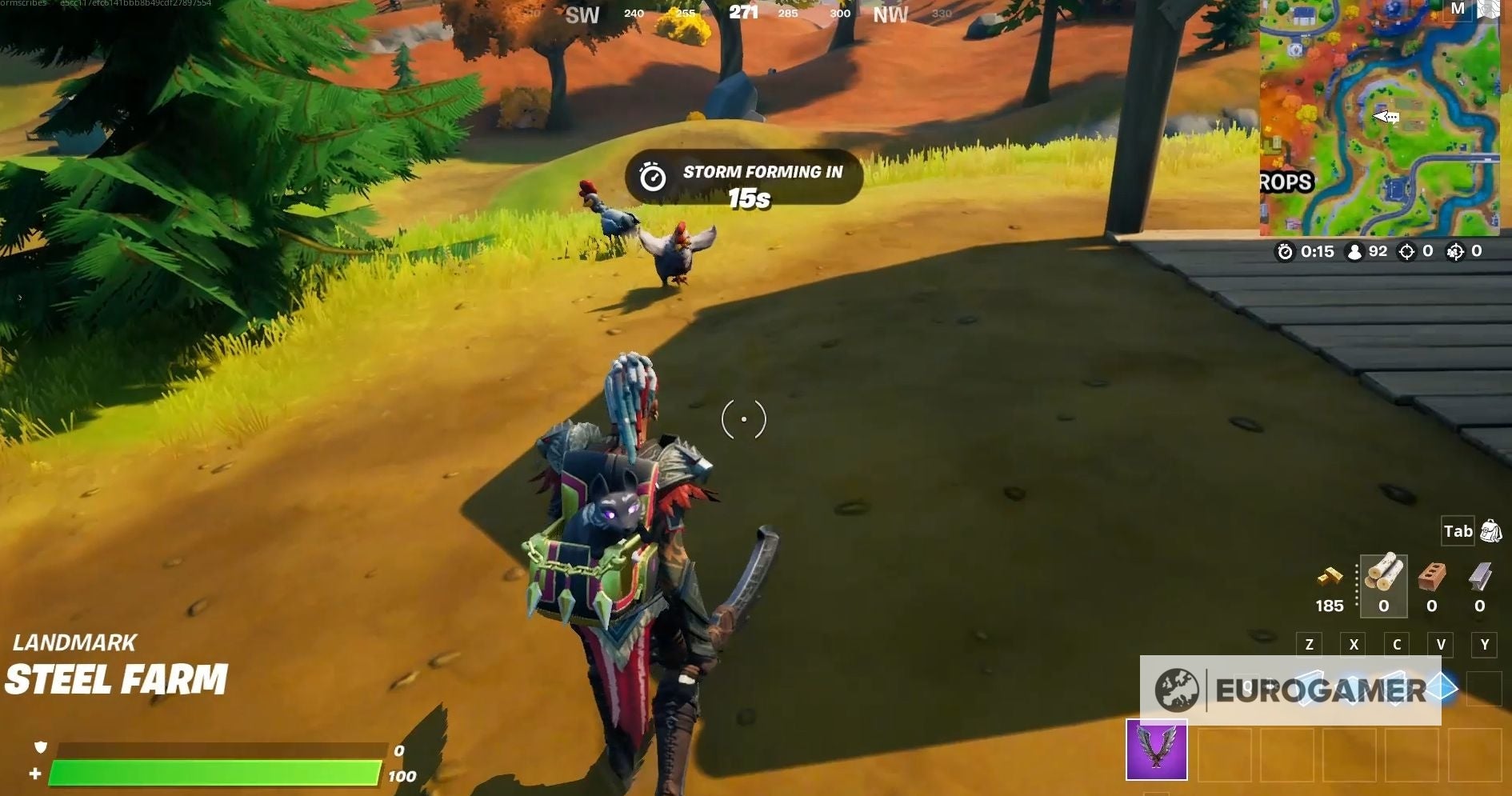 Je vindt af en toe een kip op de velden tussen de herkenningspunten en de genoemde locaties op de Fortnite map.