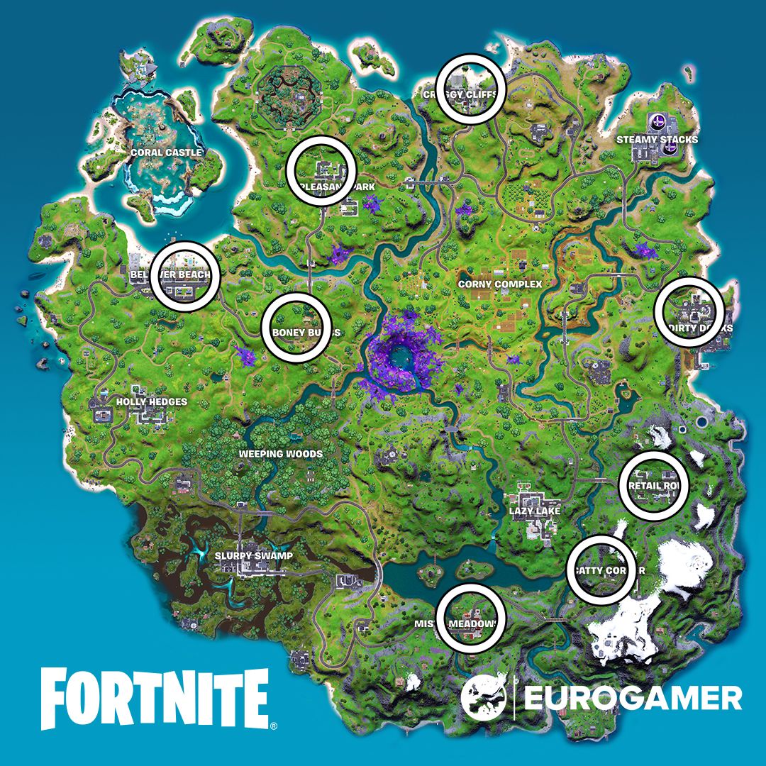 Bij het voltooien van deze opdracht heb je de keuze uit acht verschillende locaties. Dit zijn allemaal bekende plekken op de Fortnite map die je zonder twijfel onmiddellijk zal herkennen.