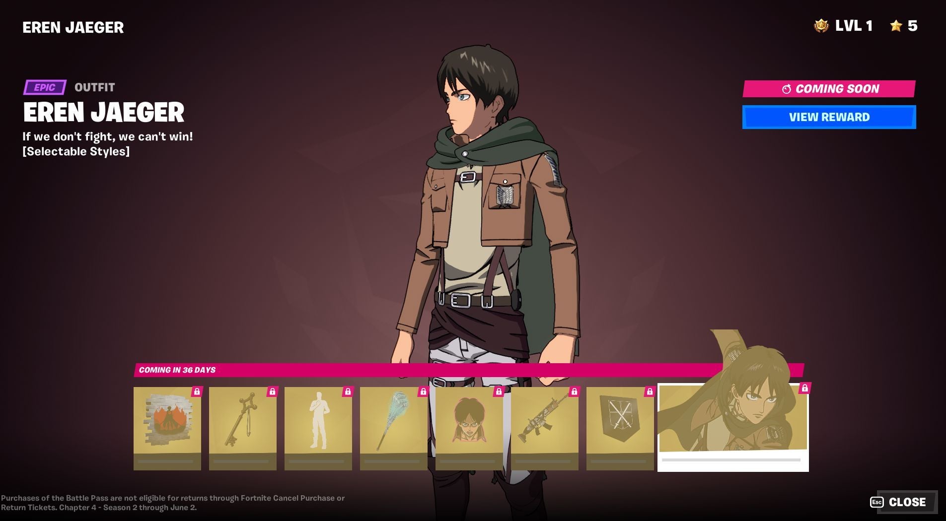 Er zijn in totaal acht Eren Jaeger beloningen, waaronder de skin zelf, vrij te spelen in Fortnite. Of er nog meer beloningen bijkomen, valt nog af te wachten.
