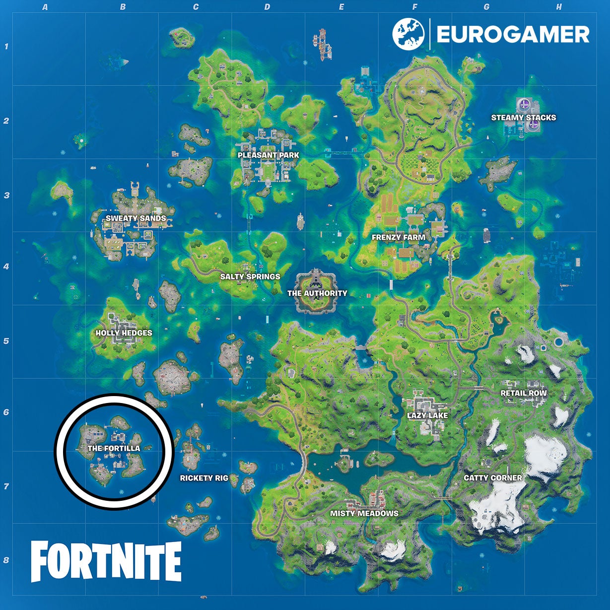 Als je bekender bent met de vorige map, dan is The Fortilla ten westen van waar vroeger Slurpy Swamp was.