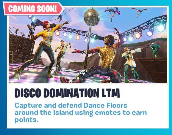 Epic Games laat weten dat Fortnite een tijdelijke Disco Domination-modus krijgt. In de nieuwe modus is het de bedoeling om dansvloeren op de map in te nemen en tegen andere spelers te verdedigen. Ondertussen gebruik je emotes om zoveel mogelijk punten te scoren.