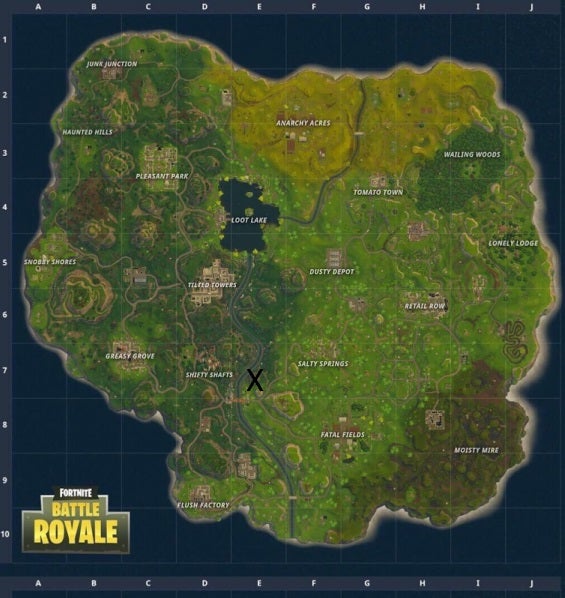 Om de exacte locatie te vinden van deze uitdaging, probeer je best te landen tussen Shifty Shafts en Salty Springs. Op die manier kun je je eenvoudig naar je doel begeven.