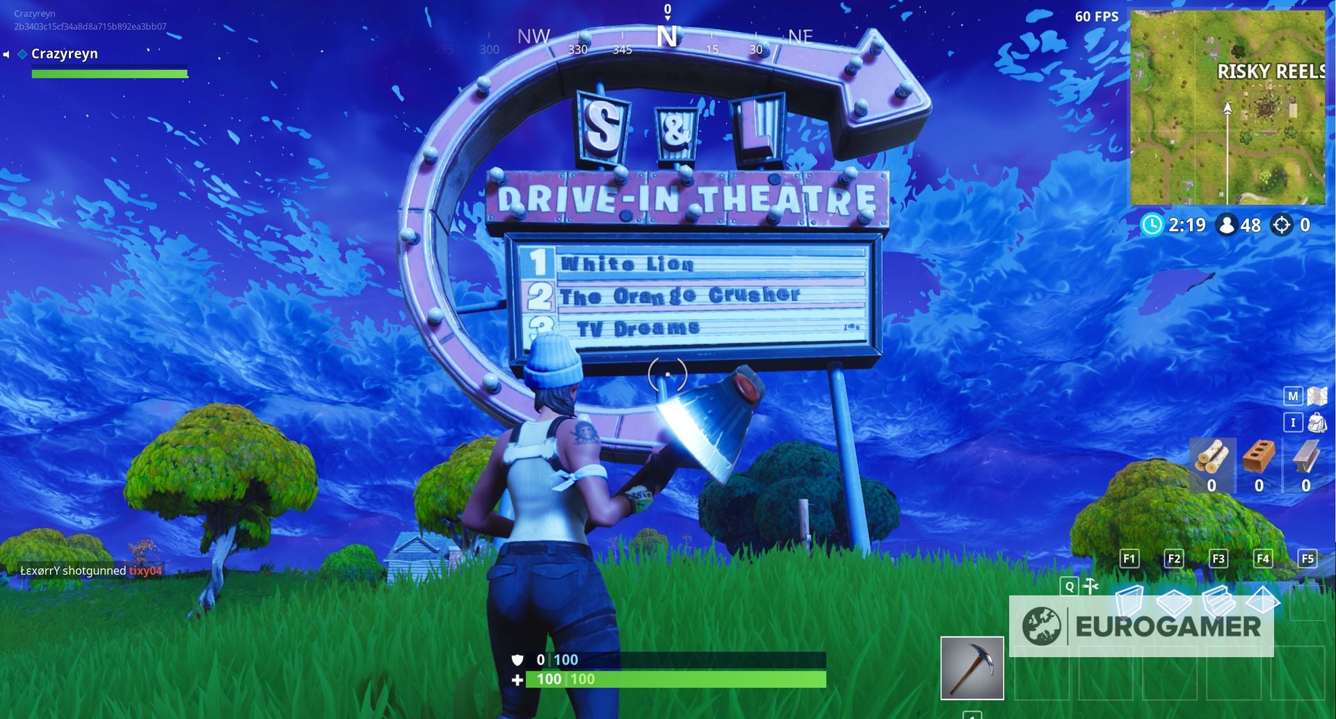 Dit betekent dat je deze objecten op de map moet vinden. In tegenstelling tot eerdere challenges, die al meteen aangaf welke objecten op de map je moest vinden, heeft Epic nu een extra stap toegevoegd. De filmtitels in kwestie zijn een bord vlakbij Risky Reels, dat drie locaties aanduidt.