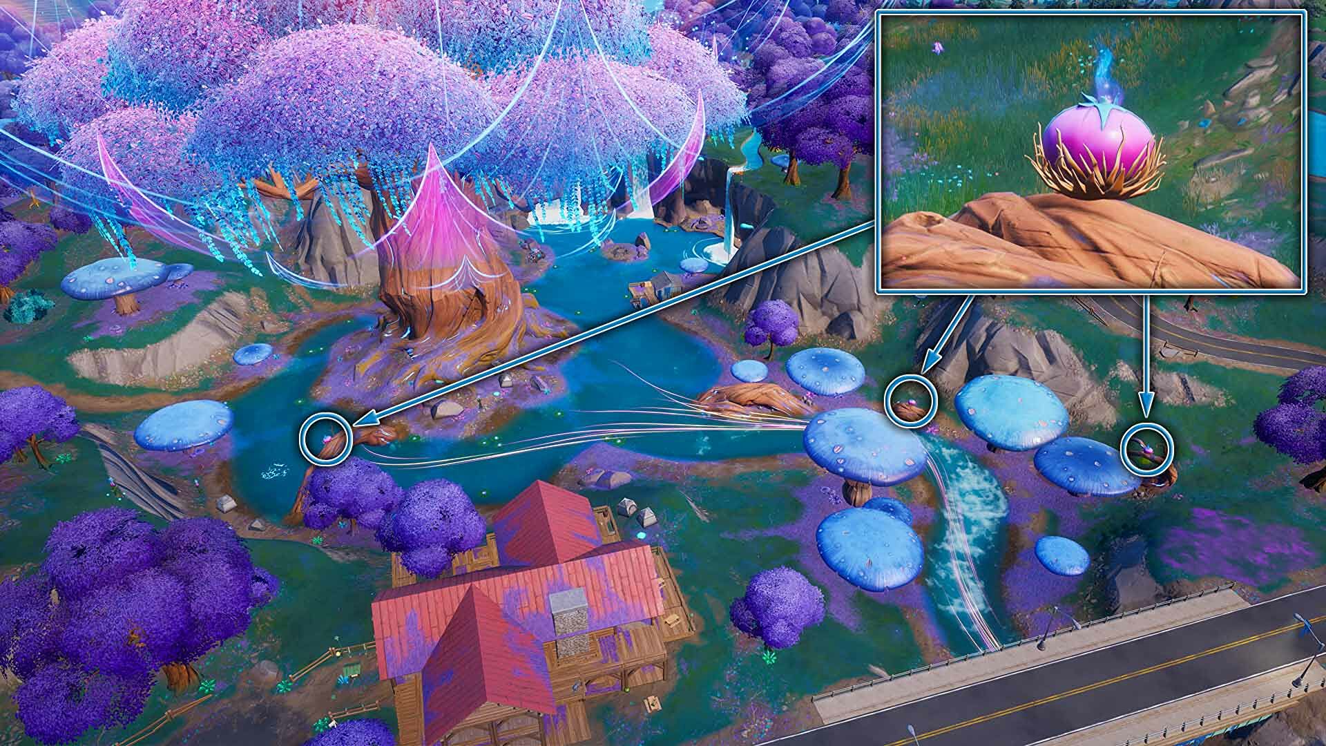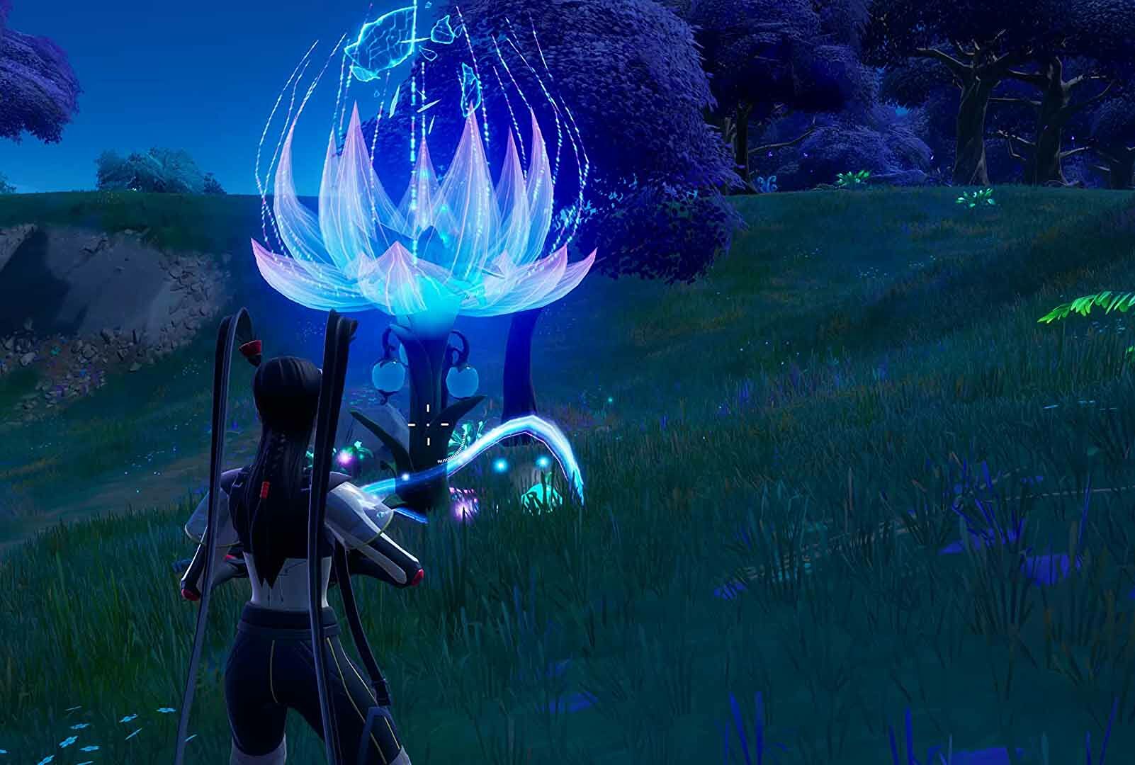- Je kunt landen bij de enorme 'Reality Tree' die in het midden van de nieuwe locatie Reality Falls groeit in het westen van de map. In die buurt vind je de grote wortels van de Reality Tree, ten noordoosten en ten zuidoosten van de boomstam. Op die wortels groeien enorme paarse knoppen. Maak deze kapot en er vliegen drie Reality Seeds uit.