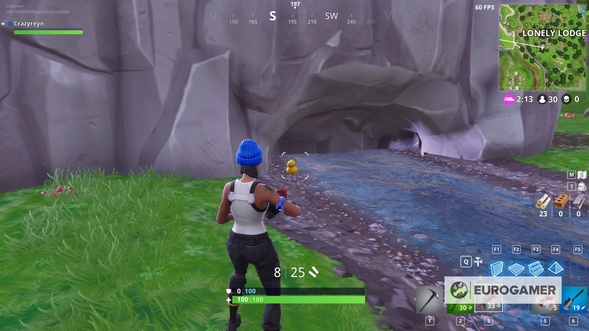 5) In het zuidoosten van Lonely Lodge vind je een stroompje naast een hut. Het stroompje eindigt in een grot, waar je de volgende Rubber Ducky vindt: