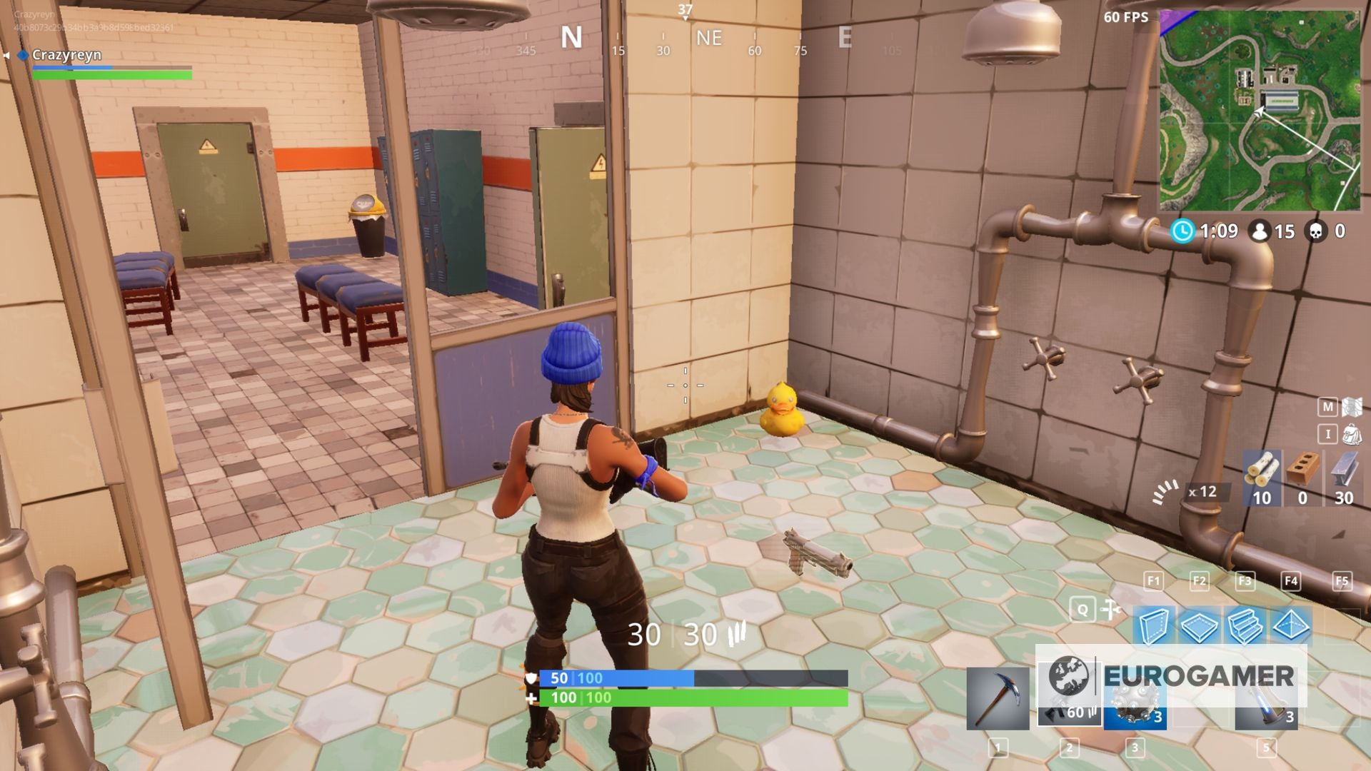 8) Tussen Snobby Shores en Tilted Towers ligt een klein dorpje met een overdekt voetbalveld. In het westelijke deel van dit gebouw vind je douches, waar je een van de Rubber Duckies vindt: