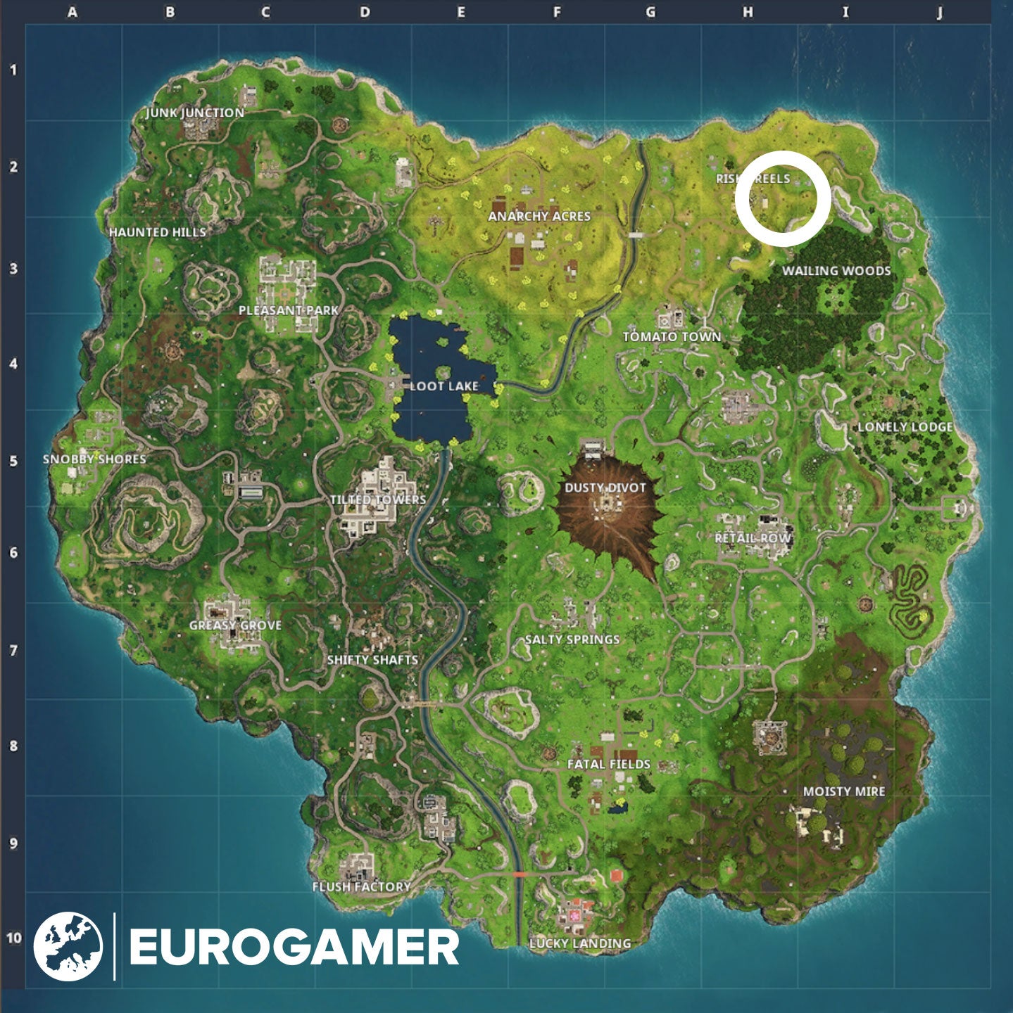 De locatie van de schat vind je net ten oosten van Risky Reels (een nieuwe locatie die bij de Season 4 map update werd toegevoegd) in vak H2: