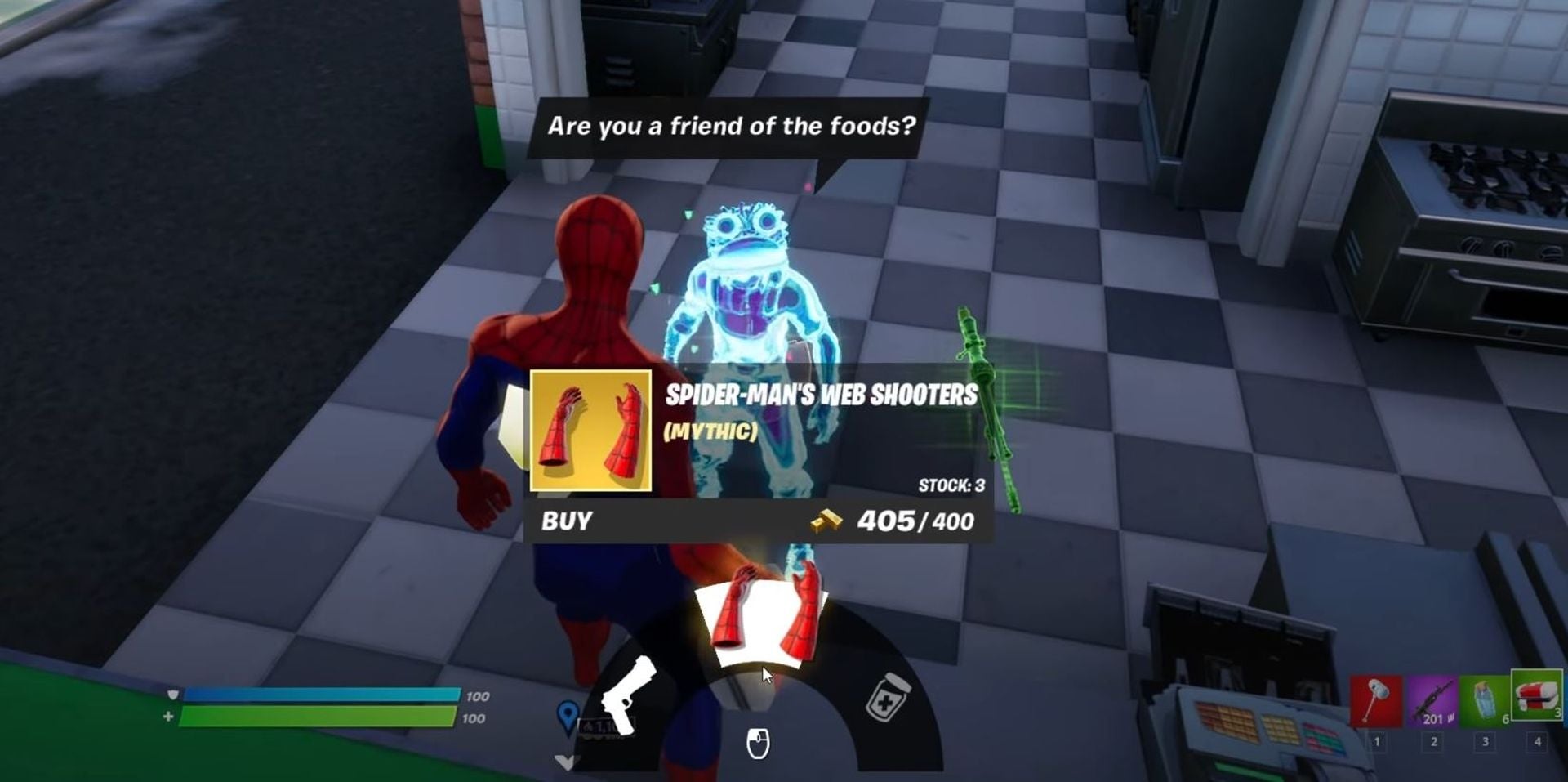Voordat je kan beginnen slingeren, moet je je eerst uitrusten met een web-shooter. Deze werkt met elke skin, dus geen zorgen - je hebt niet per se een Spider-Man outfit nodig.