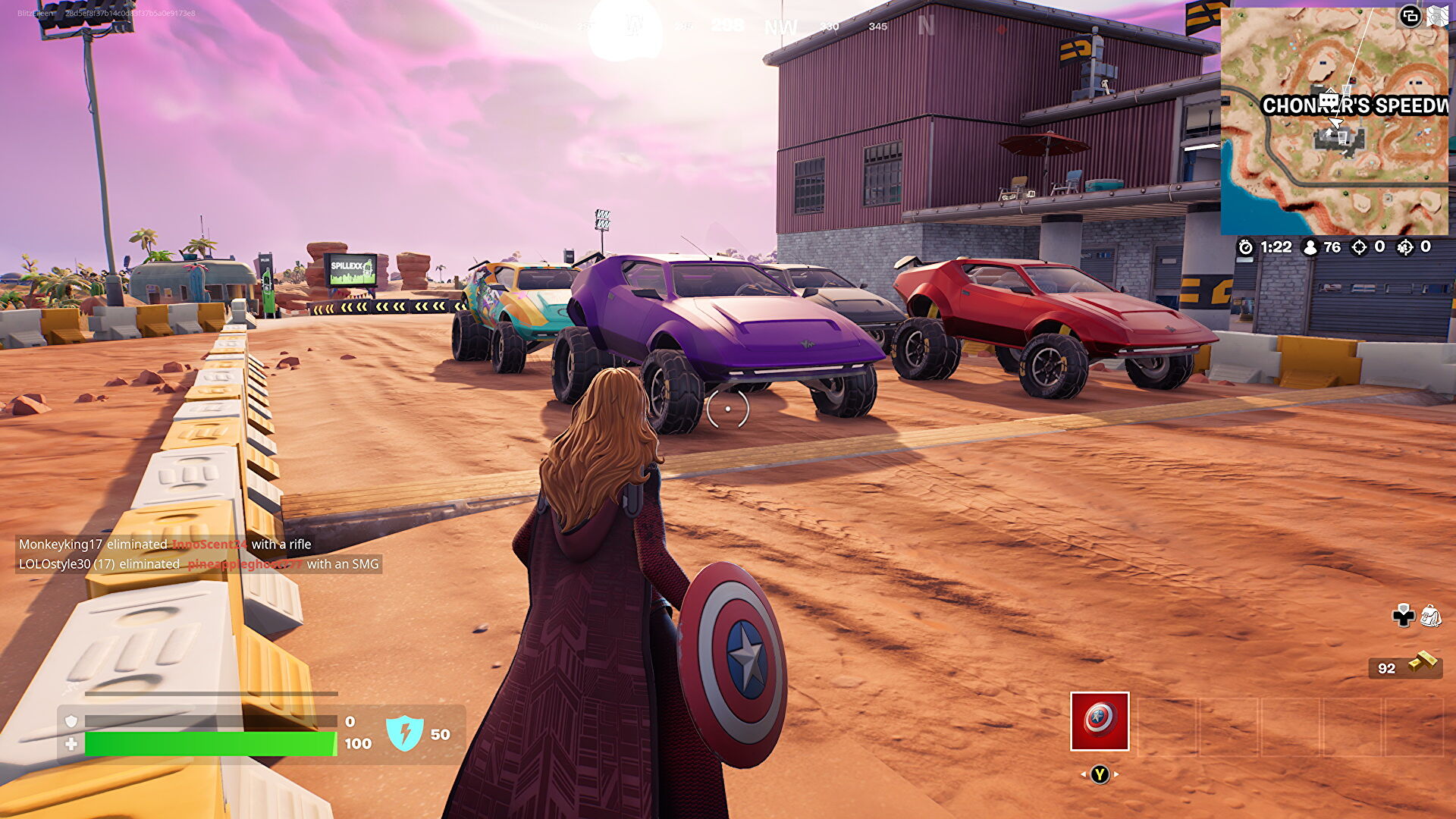 Om zeker te zijn dat je een Whiplash vindt, moet je naar Chonker's Speedway. Dit vindt je in de woestijn ten zuiden van de map. Hier zullen aan het begin van de match altijd vier Whiplash auto's tevoorschijn komen. Deze vier hebben ook altijd al meteen off-road tires dus je moet enkel nog een Cow Catcher vinden.