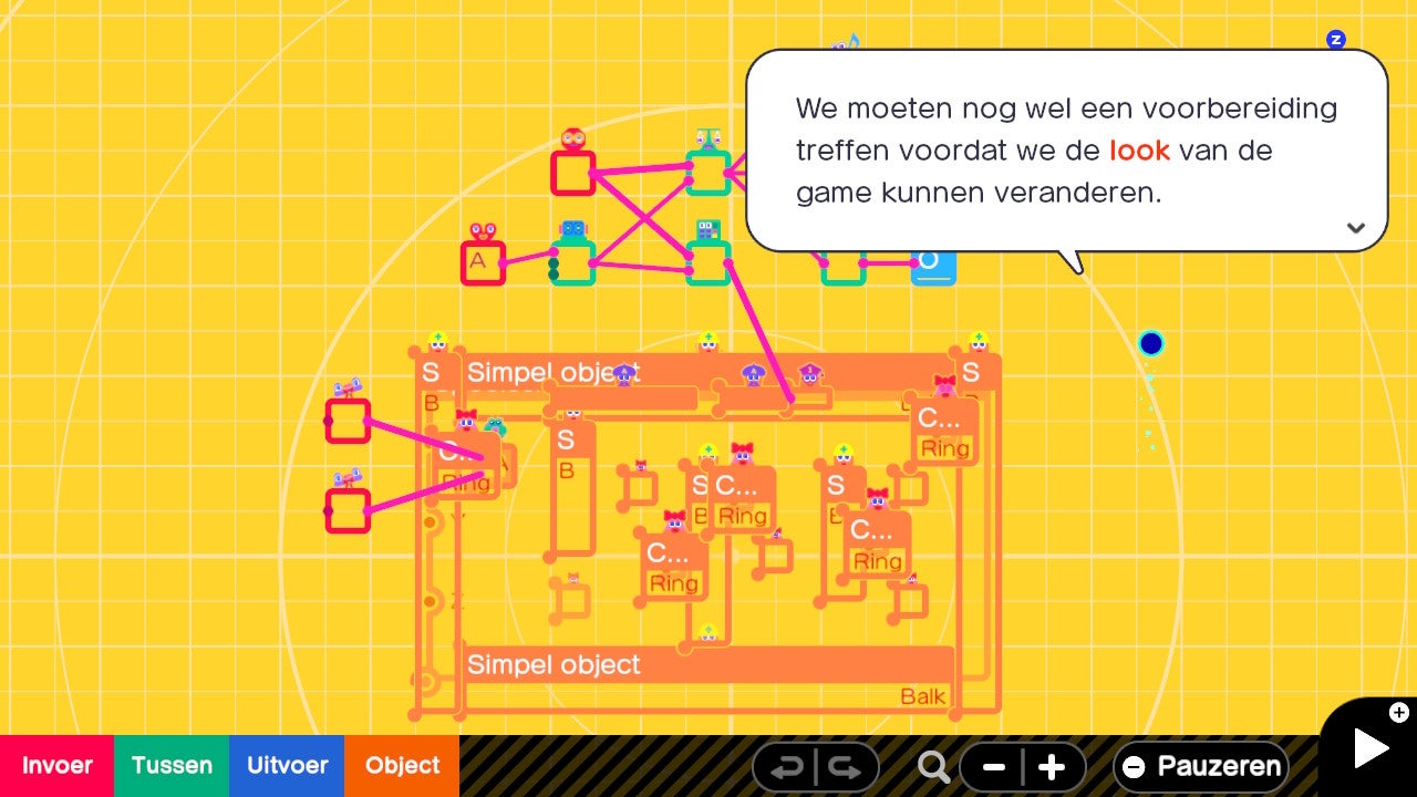Het volledige ontwikkelproces gebeurt via 'node-based programming', verhult in een typisch Nintendo-sausje. Deze nodes worden in Gamestudio 'Knopix' genoemd. Die wezens helpen Bob tijdens zijn lessen, en hun opvallende persoonlijkheden zorgen ervoor dat je vrijwel meteen hun functie in het programmeren begrijpt. Zo is Balk verantwoordelijk voor muren in de game en gedraagt die zich als een stoere bouwvakker. Niet is dan weer een tegendraadse vlegel die code bewust niet laat werken en Vergelijking legt alles in zijn weegschaal. Zo ben je op een speelse manier bezig met wat in elke andere game-engine saaie materie is, maar leer je concepten die je als programmeur en gamedesigner ook in andere game-engines kunt toepassen. Dat maakt Gamestudio een enorm waardevolle opstap naar de 'grote jongens' van de game-engines, zoals Unreal Engine 4.