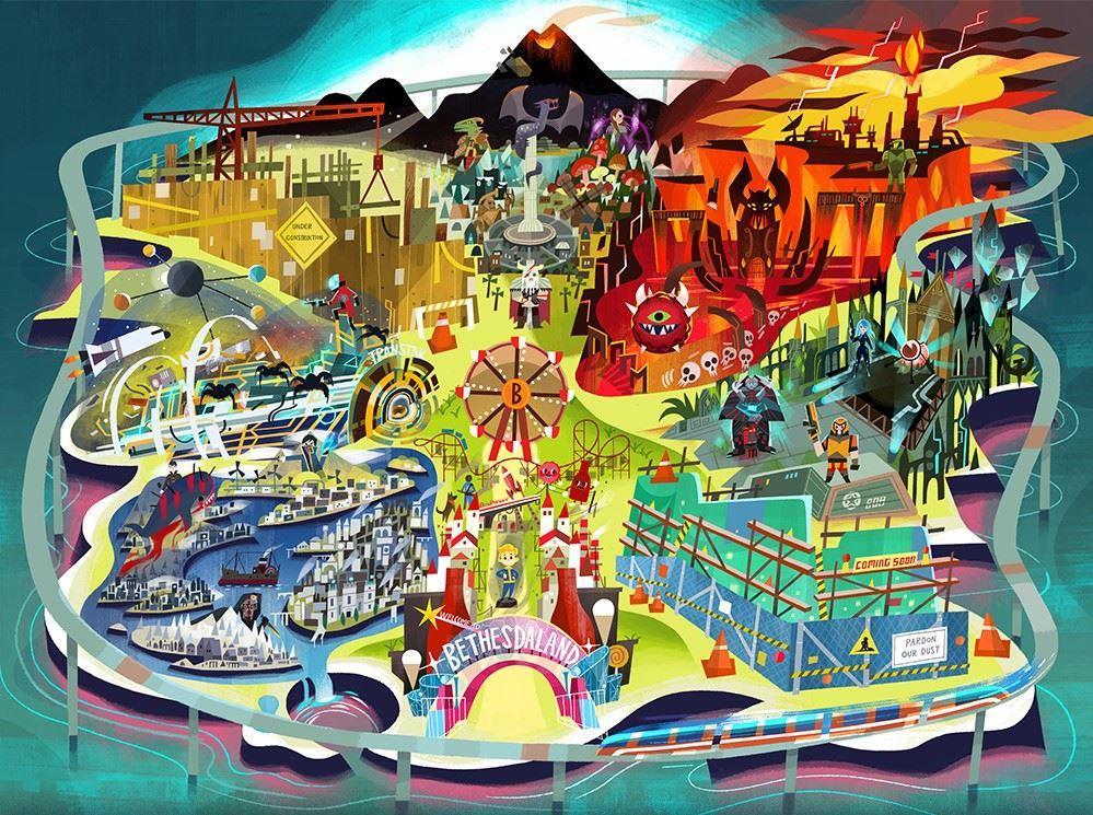 Op de afbeelding is het fictieve pretpark Bethesdaland afgebeeld. Games als Skyrim, Doom, Quake Champions en Prey hebben hun eigen werelden, maar er zijn ook twee segmenten waar 'Coming Soon' en 'Under Construction' staat afgebeeld.