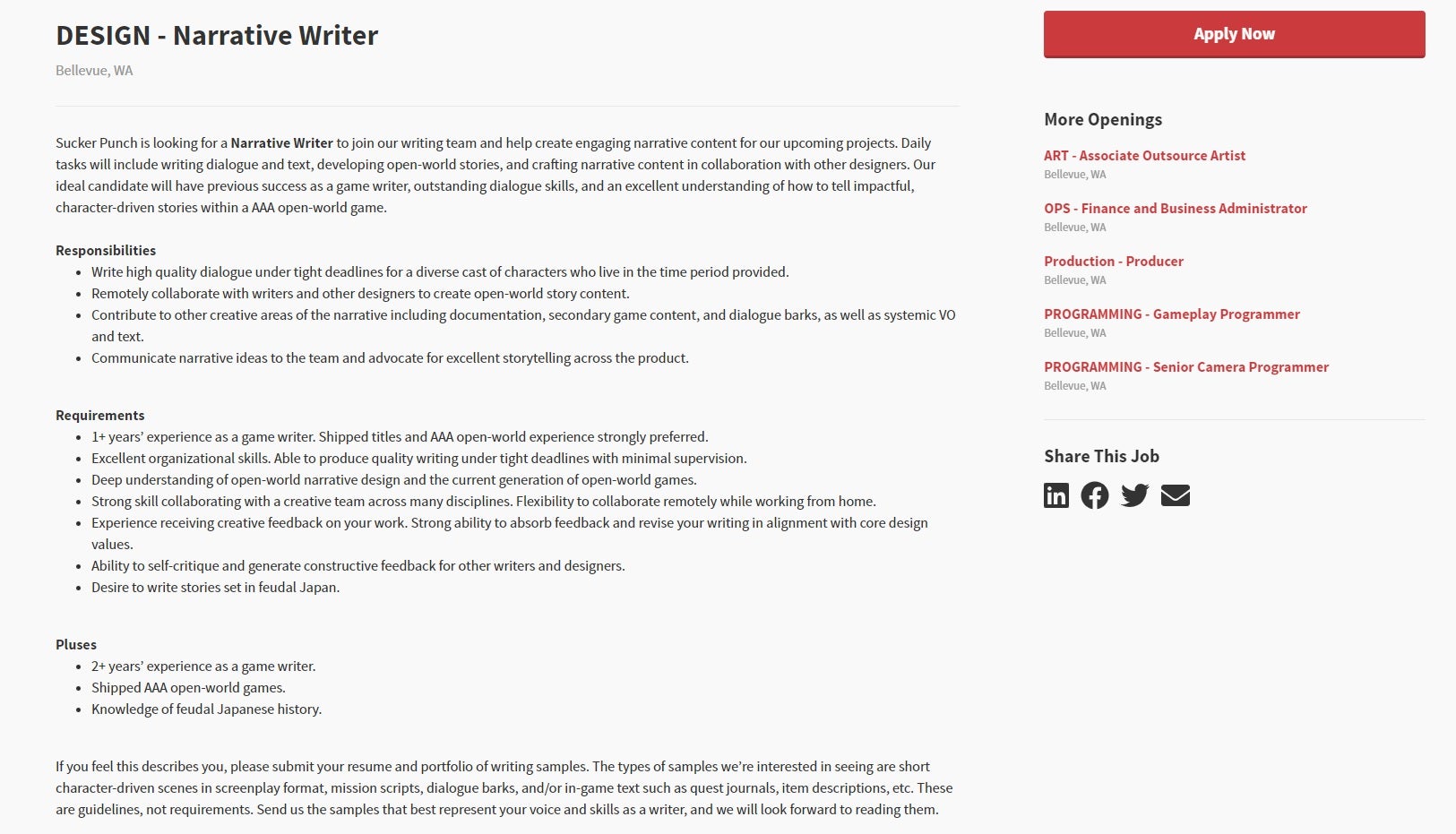 Wanneer je de vacature van de narrative writer bekijkt, dan zie je dat het hier gaat over een functie die nodig is voor het schrijven van meerdere aanlokkelijke verhalen van toekomstige projecten. Of een van die toekomstige projecten een Ghost of Tsushima sequel is, is momenteel koffiedik kijken, maar zeker niet uitgesloten.