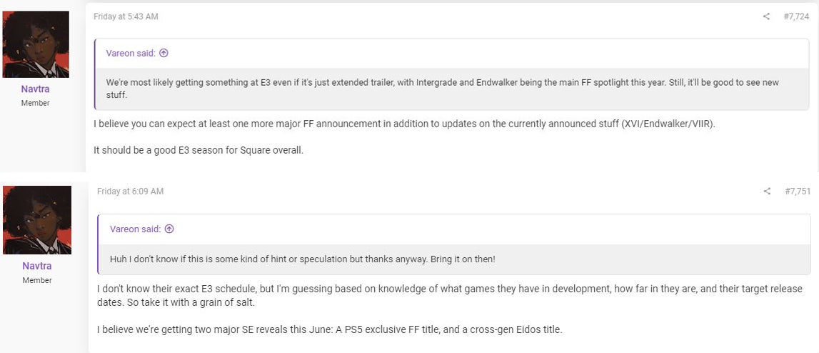 Verder onthult de insider dat Square Enix tijdens de persconferentie meer updates zal geven over projecten zoals Final Fantasy 16, Final Fantasy 7 Remake en het recent aangekondigde Final Fantasy 14: Endwalker.