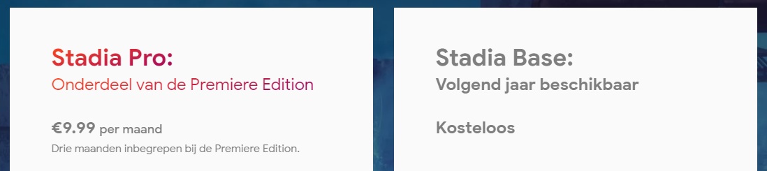 Om van Google Stadia gebruik te kunnen maken, heb je in de basis een abonnement nodig. Pro is de betaalde versie van Google Stadia en kost 9,99 euro per maand. Dat abonnement ondersteunt momenteel een resolutie tot 4K, framesnelheid tot 60 FPS en 5.1 surround sound. Bovendien krijg je net als PlayStation Plus en Xbox Live Gold toegang tot gratis games. Bij de lancering is dat Destiny 2: The Collection. Tevens maak je aanspraak op exclusieve kortingen. Let wel: Stadia Pro is geen Netflix voor games. Games dien je dus los aan te schaffen.