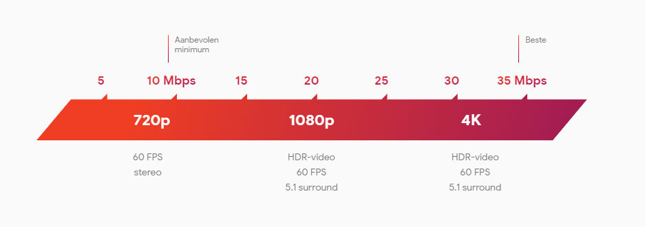 Om te kunnen gamen is een internetverbinding van 10 Mbps een minimale vereiste. Daarmee zijn de games speelbaar op een resolutie van 720p, een framerate van 60 fps en met stereogeluid. Wil je gamen met specificaties als HDR video, 1080p en 5.1 surround? Dan heb je het beste een 20 Mbps internetverbinding. Voor 4K gaming moet de bandbreedte op minstens 35 Mbps liggen.