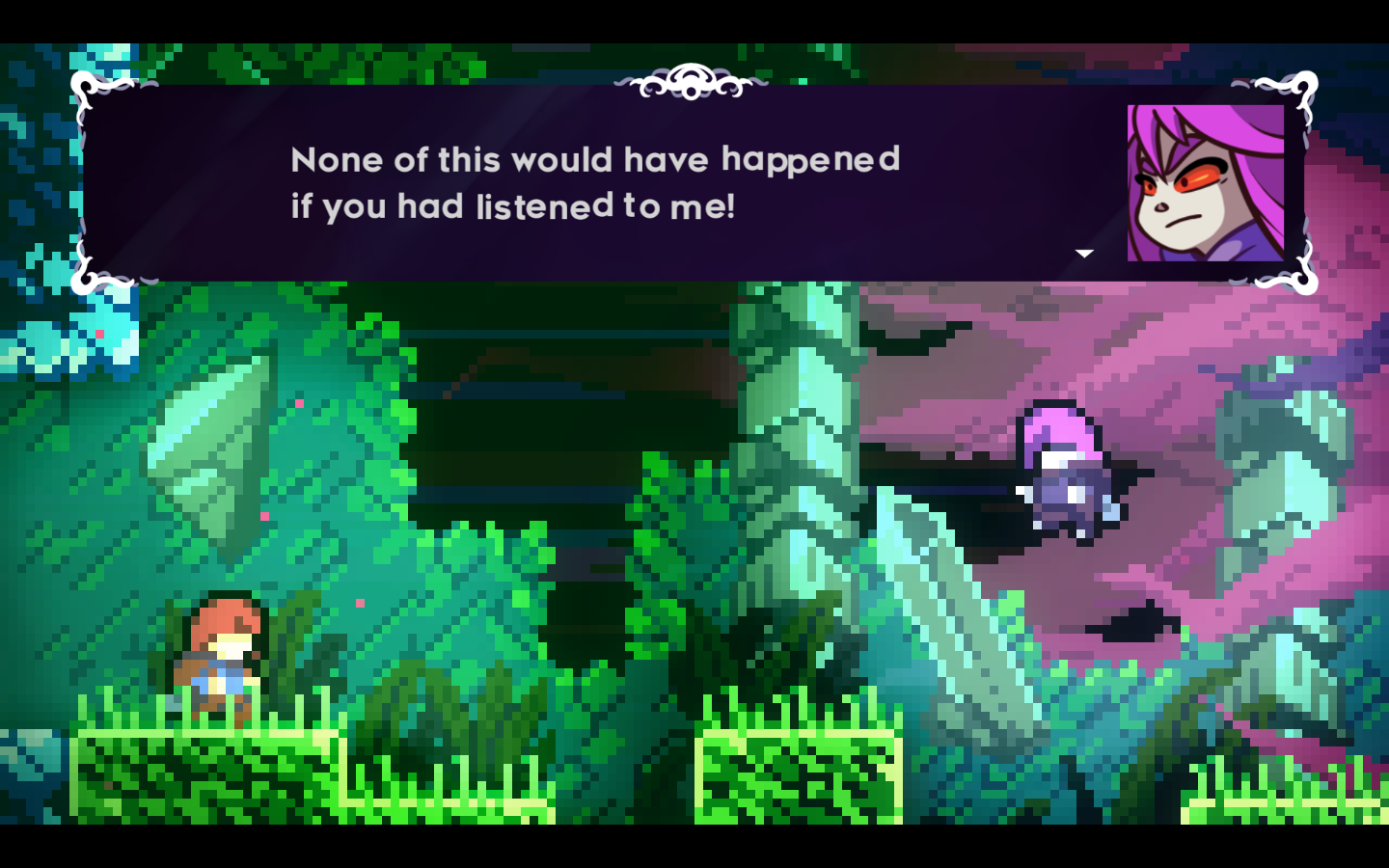 Geloof het of niet, Badeline bedoelt het goed. Ze probeert Madeline te beschermen, ook al weet ze niet goed hoe. Na een wild gevecht in de onderbuik van de berg geeft ze dat ook toe: ze is bang en slaat daarom wild om zich heen, in de hoop dat ze daarmee Madeline kan redden van pijn en gevaar. Madeline omhelst haar en hun vriendschap wordt omgetoverd tot doorzettingsvermogen, vastberadenheid en een stevige dosis badassery die doorslaat naar de gameplay in de vorm van een dubbele Air Dash. Het is duidelijk dat een gebalanceerde fusie van de twee voor een beter geheel zorgt. Het laatste hoofdstuk is daarom eerder een triomftocht dan het moeilijkste level dat alle obstakels combineert. De game telt letterlijk af naar de top van de berg, en daar aangekomen is er eindelijk een nieuw begin voor Madeline. Fin.