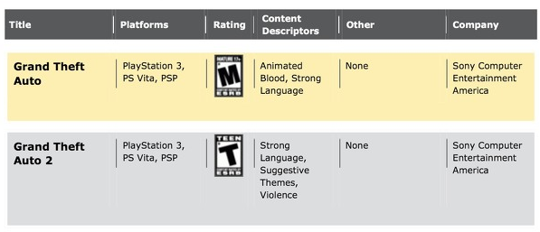 Deze screenshot genomen van de website van de ESRB, de Amerikaanse instantie die zich bezighoudt met het beoordelen van videospellen, verklapt dat de twee eerste GTA games naar de PS3, Vita en PSP komen.