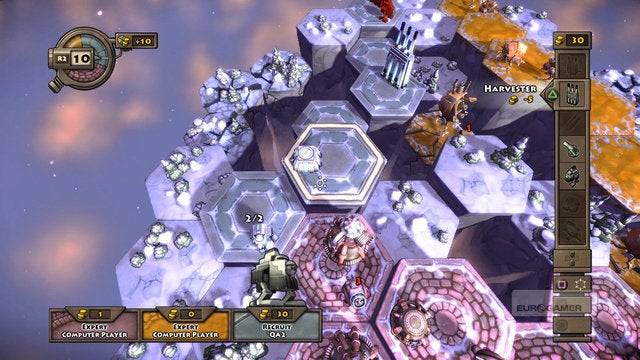 Hierdoor blijft het aantal keuzes dat je per beurt kunt maken beperkt, en maar goed ook. Je hebt zestig seconden de tijd om alles op orde te stellen voordat de tegenstanders weer aan zet zijn. Omdat veel acties ook meerdere beurten nodig hebben – het duurt zo’n viertal beurten om uit het niets een schietklaar kanon te bouwen – is vooruitdenken dan ook cruciaal. Zal het vakje waar je kanon op staat überhaupt wel nog bestaan tegen dat de volgende raket klaar is? Naar welke veilige plek op de kaart kun je je Walkers sturen? En waar ga je straks je Harvesters nog kunnen neerzetten wanneer je huidige de afgrond in verdwijnen? En zo is Greed Corp. één lange oefening in het vooruitdenken.