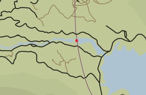 In de buurt van de waterval, in de rivier onder de brug zijn een aantal bruine rotsen. Op een van die rotsen is het ruimteschipdeel.