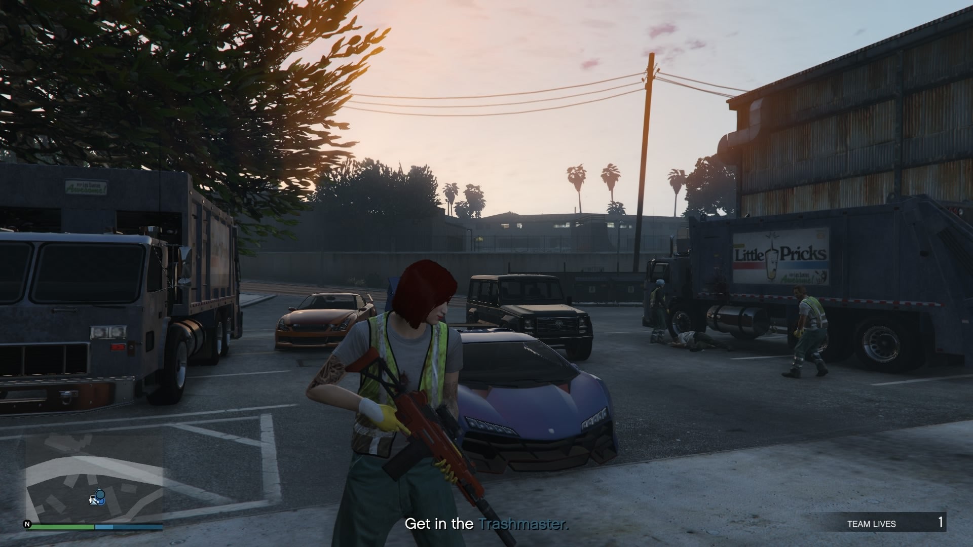 Het doel is om vuilniszakken met pillen van de Vagos te stelen. Er zijn twee teams in deze job: Operators en Collectors. Ga naar de South LS Recycling en steel de vuilniswagen. De Operators rijden en de Collectors staan achterop de vuilniswagen.
