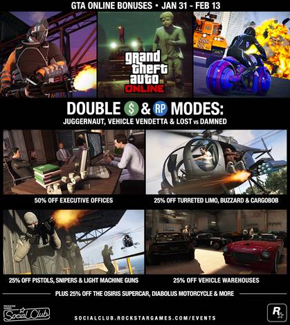 De komende twee weken kun je ook dubbel zoveel GTA$ en RP verdienen bij het spelen van Juggernaut, Vehicle Vendetta en Lost vs Damned. Er is ook een speciale playlist gemaakt met de Vehicle Vendetta II, Deadline IV en Power Play III maps.