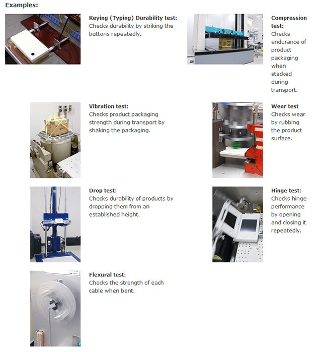 Zo is er onder meer een machine te zien die herhaaldelijk op de knopjes hamert om de soliditeit te testen. Een andere laat de 3DS van grote hoogte vallen om te zien of 'ie de val overleeft, en er is een machine die met hoge snelheid over de touchscreen wrijft om te checken op krasbestendigheid. Er is een apparaat dat de 3DS constant open en dicht klapt om de scharnieren te testen, en verschillende units worden samengeperst om te zien hoeveel 3DS'en op elkaar gestapeld kunnen worden voor transport.