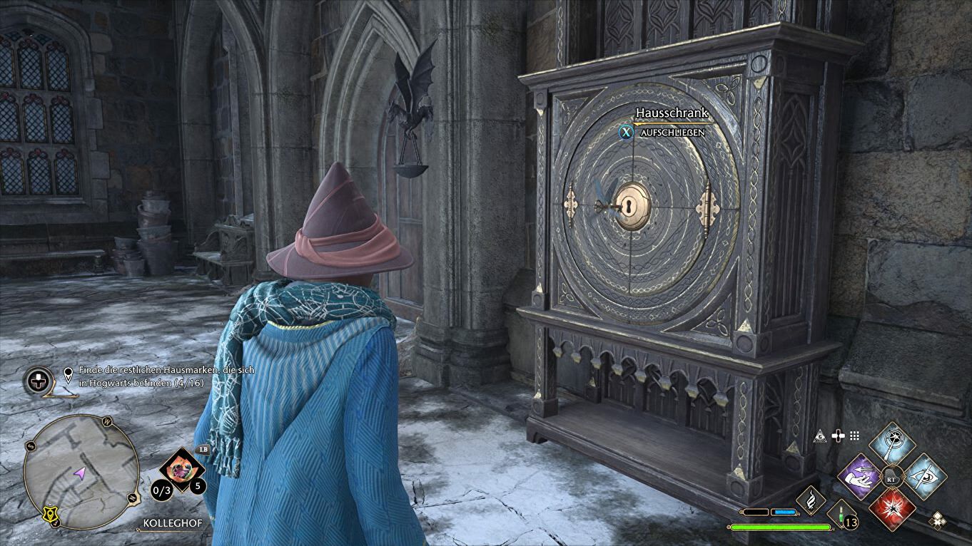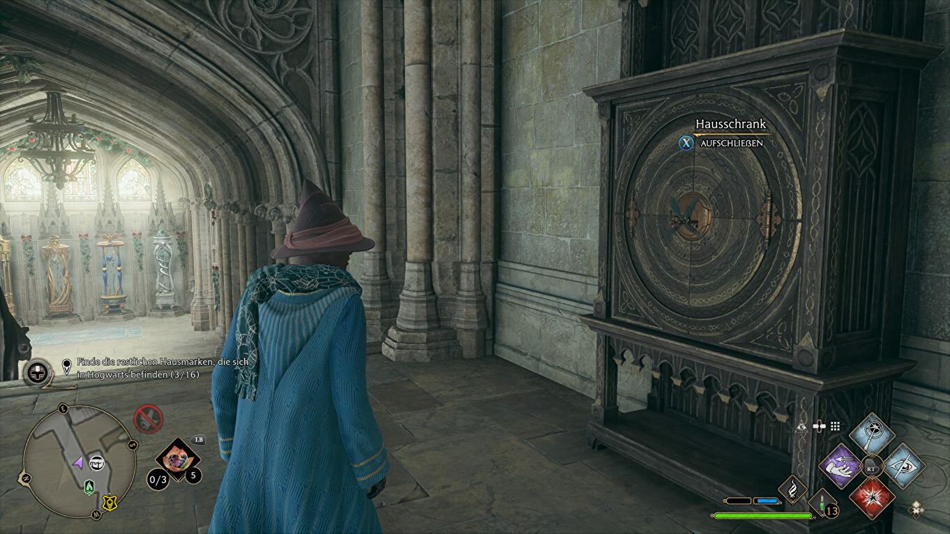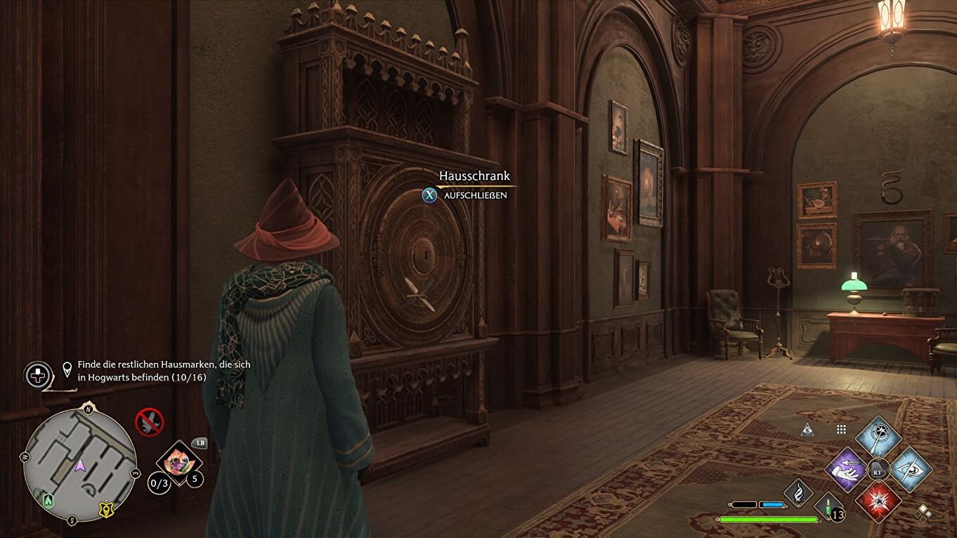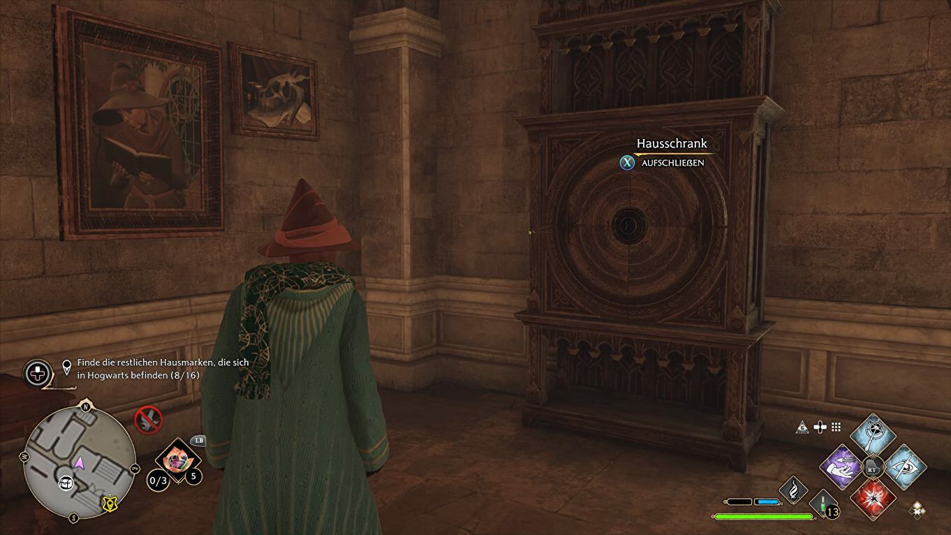 Locatie: Begin in de South Wing > Hospital Wing, draai je na de fast travel om en volg de wenteltrap naar beneden naast de Floo Flame. Het Cabinet staat links, de sleutel vliegt rond in de gang rechts: