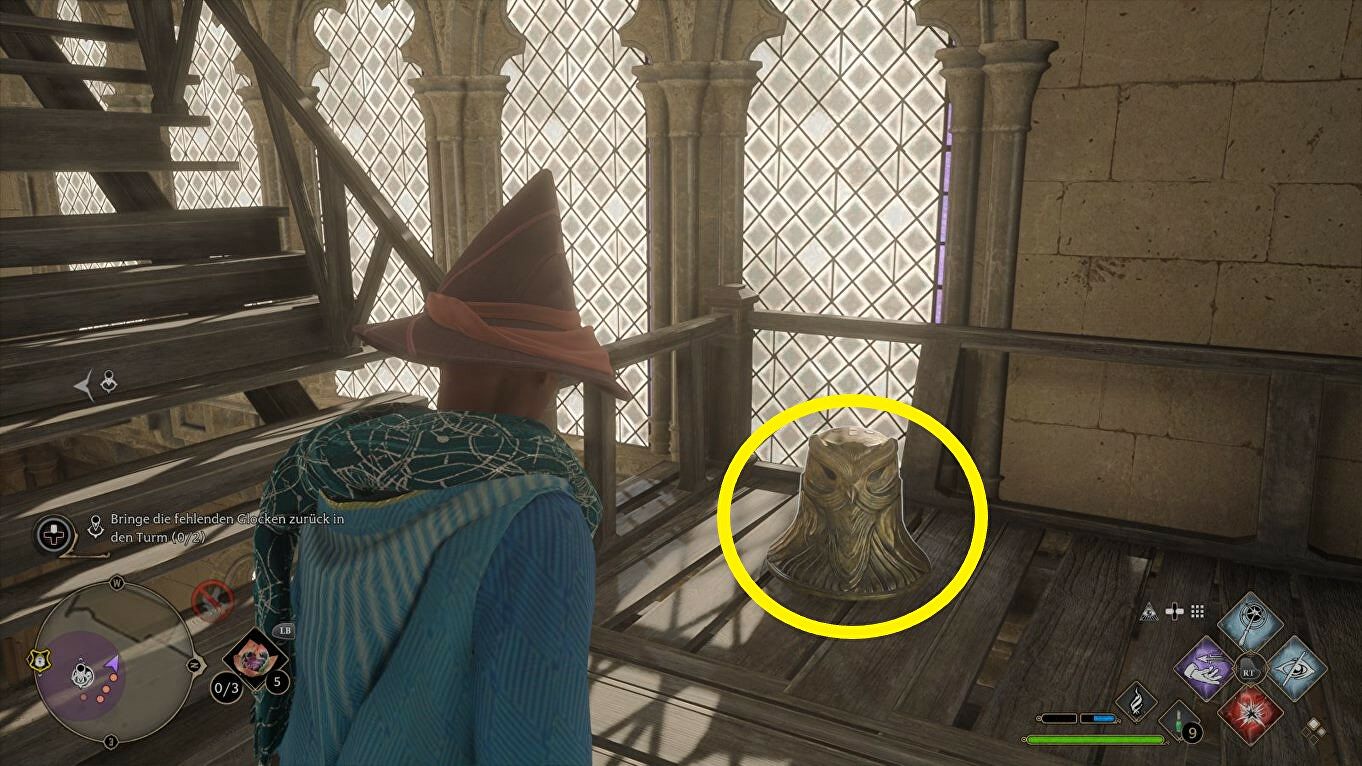 Voor die tweede klok loop je verder omhoog en zoek je hem op deze plek vlak voor de top van de toren (rechts van de trap):