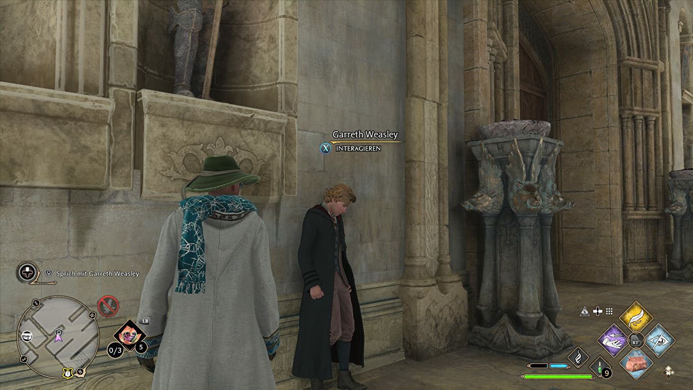 Tijdens de game verschijnt in de Great Hall een marker boven Garreth Weasley, die daar nonchalant leunt tegen de muur. Vraag waar hij aan denkt, en hij vertelt over een Potion waar hij aan werkt, maar dat een belangrijk ingredient mist: Billywig Strings. We besluiten hem te helpen en het ontbrekende ingredient te halen.