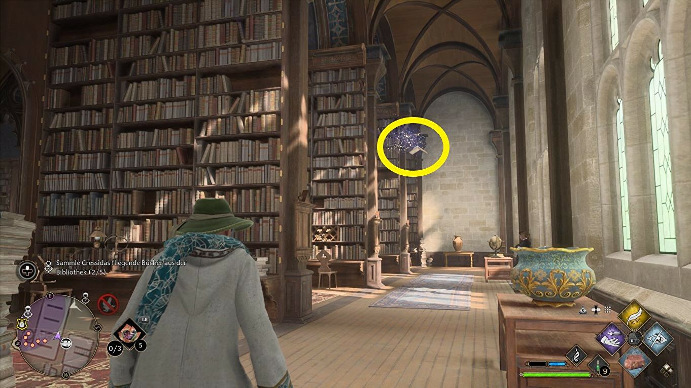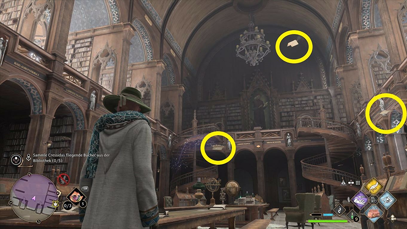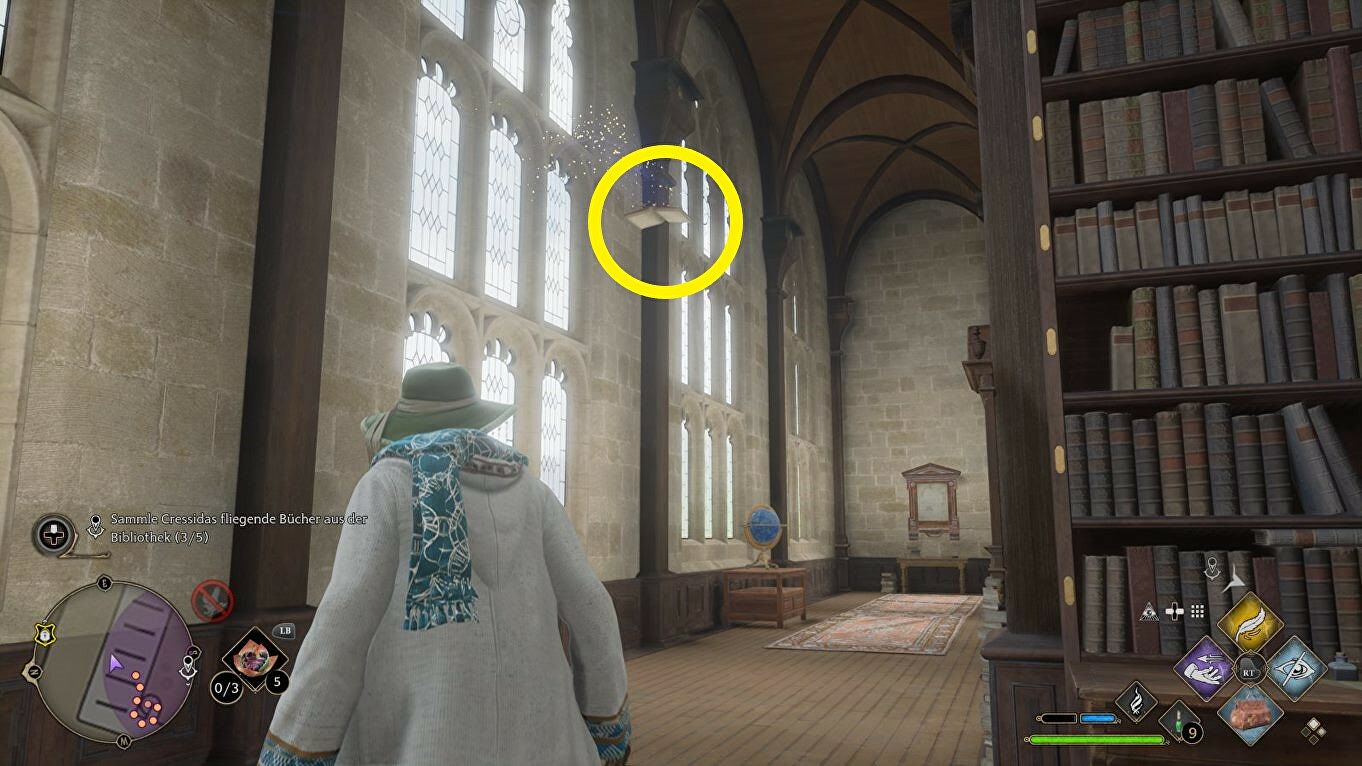 Als je in de Library staat, kijk dan omhoog en je ziet waarschijnlijk meteen al twee van de vliegende boeken. De derde is een Field Guide Page en telt niet mee voor de missie):