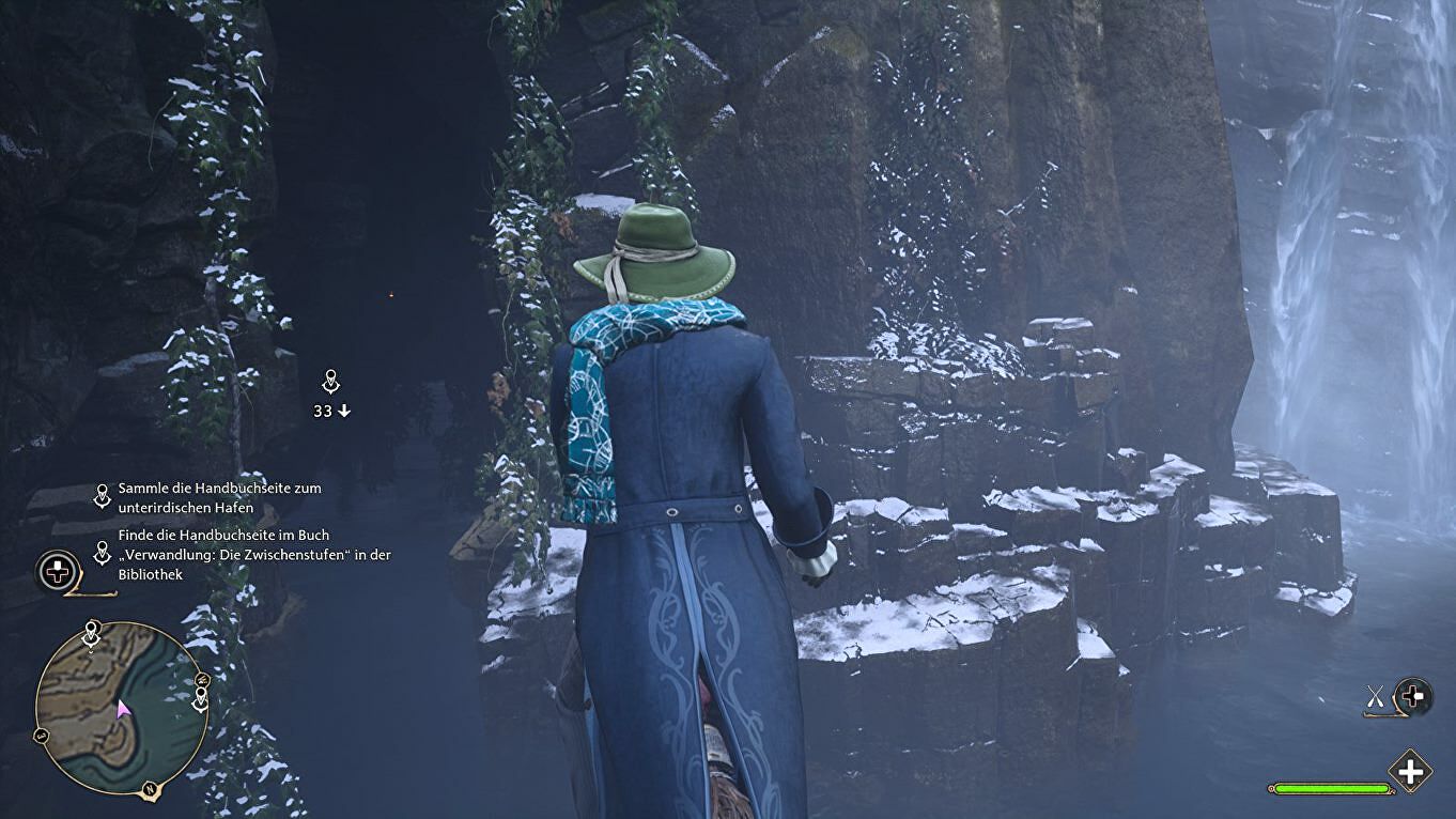 Vlak voor de Great Hall steek je de brug over en vlieg je met je bezem links naar beneden. Ga langs de rotswand naar beneden richting de marker. Links van de waterval kan je een kleine grot in zwemmen: