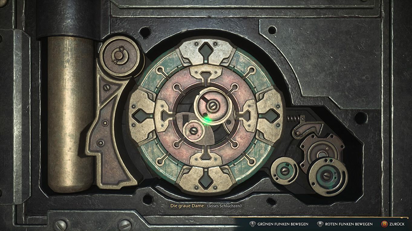 In de mini-game zien we een close-up van het slot. Dit bestaat uit verschillende ronde schijven, zoals je hieronder ziet.