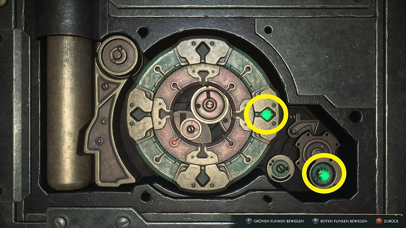 Gebruik de linker joystick om de buitenste ring te draaien. Draai tot de controller trilt en er een groen lampje aan de rand van het slot begint te branden. Je moet ondertussen de linker joystick in dezelfde positie houden.