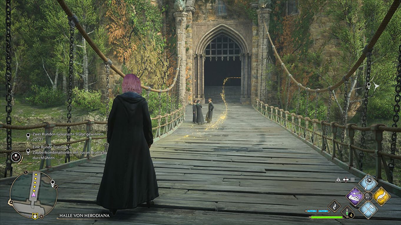 Volg nu de quest "Crossed Wands" tot je twee rondes hebt gewonnen tegen menselijke tegenstanders en één ronde hebt gewonnen tegen een trainingsdummy. Daarna kan je verder.