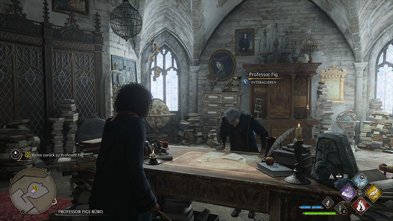 Als je Incendio geleerd en geactiveerd hebt, keer je terug naar Fig en praat je nog eens tegen de excentrieke Professor.